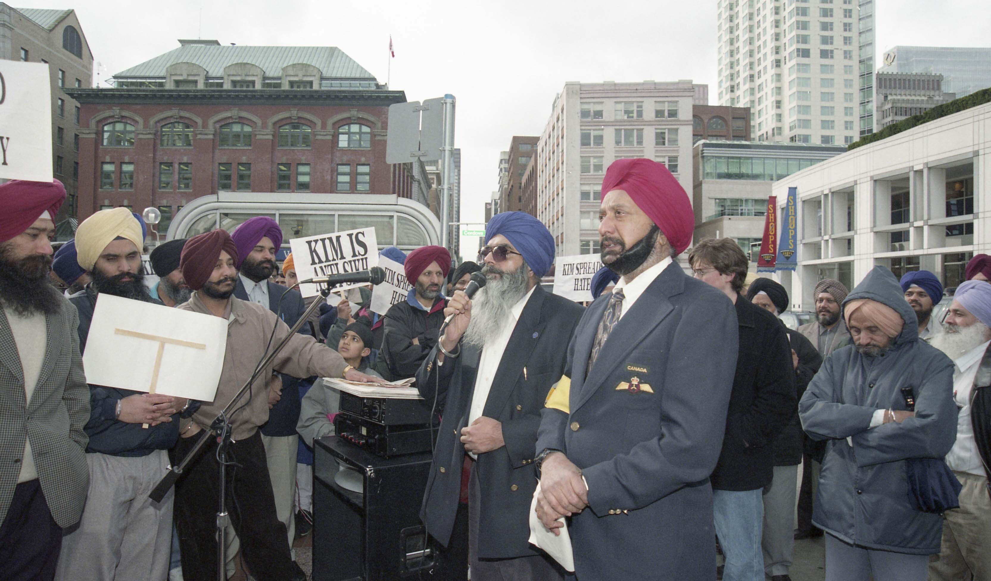 Photograph of a group of unidentified individuals outside the Vancouver Sun office, located at Granville Square in Vancouver, British Columbia (B.C.). Individuals had gathered outside The Vancouver Sun office to protest against Kim Bolan.