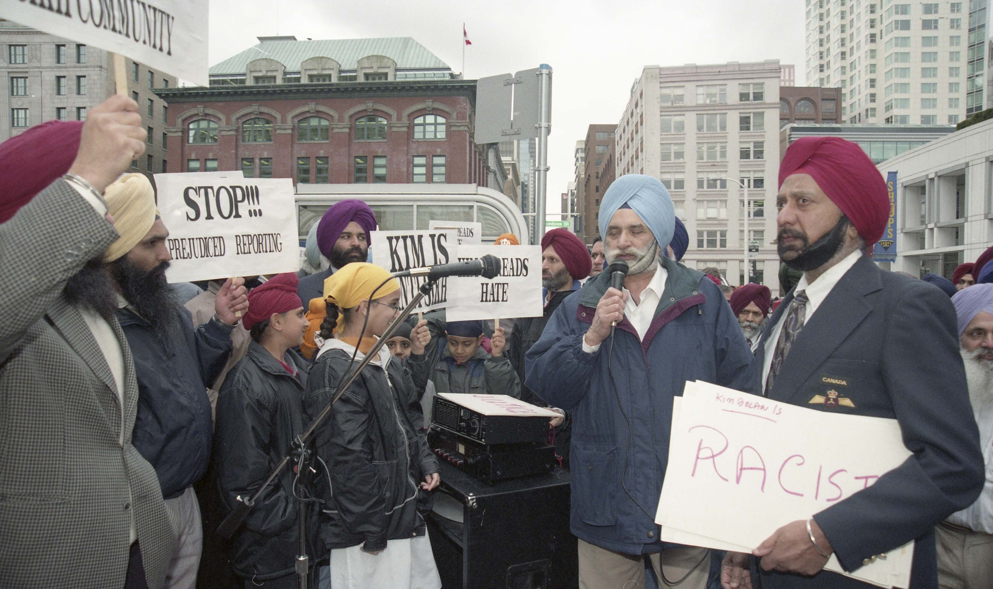 Photograph of a group of unidentified individuals outside the Vancouver Sun office, located at Granville Square in Vancouver, British Columbia (B.C.). Individuals had gathered outside The Vancouver Sun office to protest against Kim Bolan.