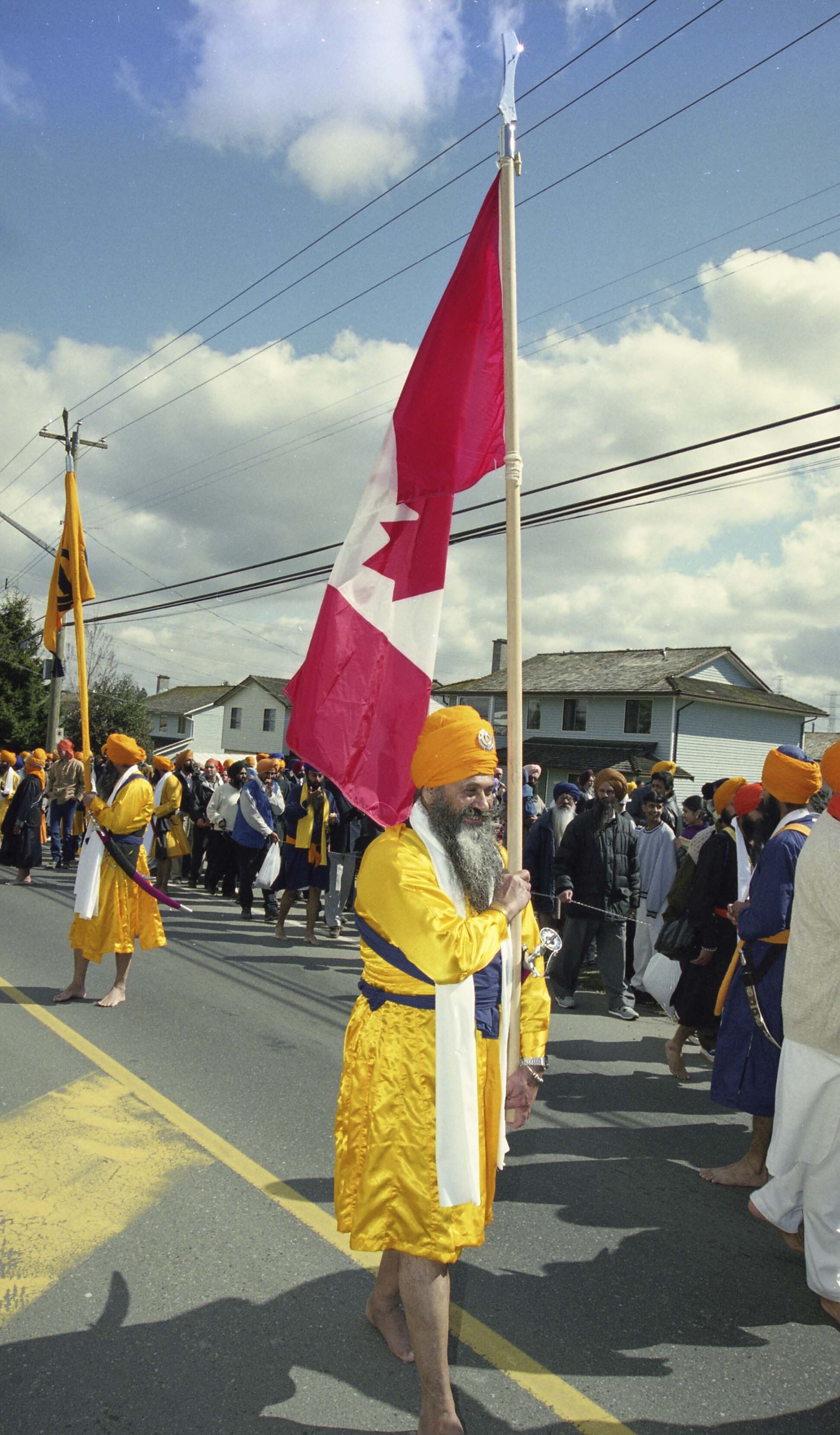 Photograph of an unidentified individual, known as a gursikh, holding a flag at the Vaisakhi Nagar Kirtan held in Surrey, British Columbia (B.C.). Gursikhs are Sikhs devoted to the Guru and the teachings of Sikhi.