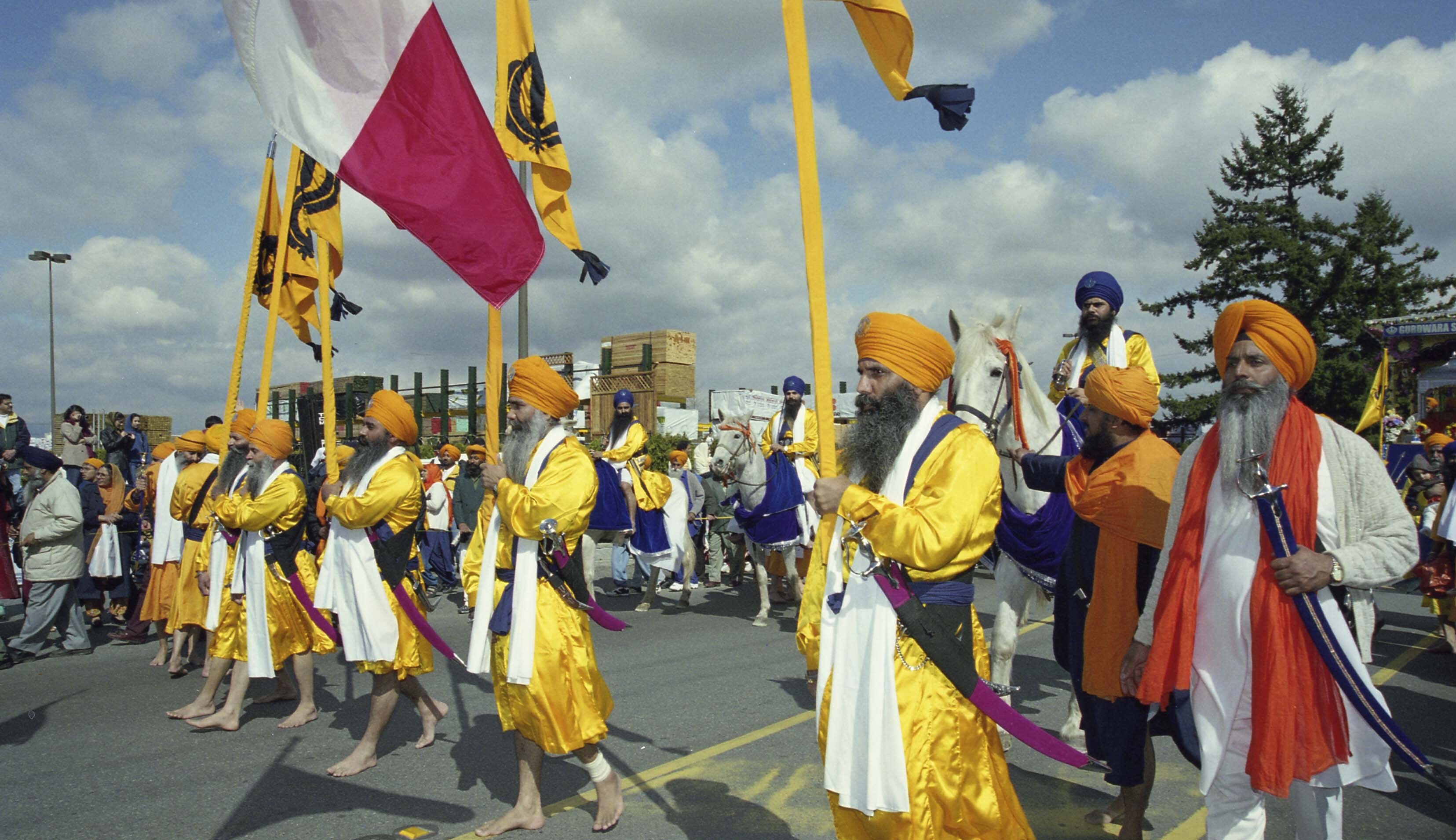 Photograph of a group of unidentified individuals, known as gursikhs, holding flags at the Vaisakhi Nagar Kirtan held in Surrey, British Columbia (B.C.).