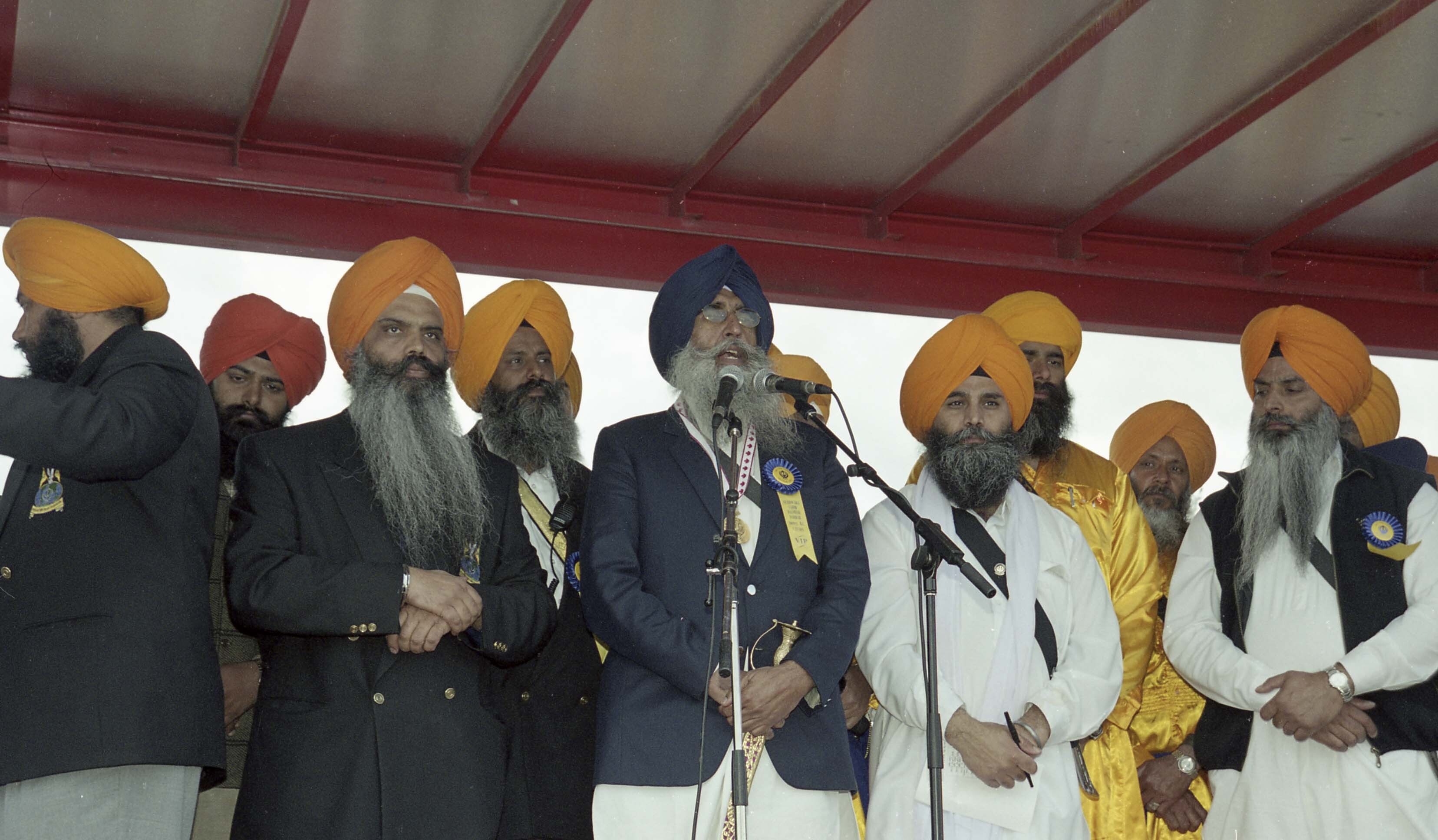 Photograph of a group of unidentified individuals onstage as an unidentified speaker addresses the audience at the Vaisakhi Nagar Kirtan held in Surrey, British Columbia (B.C.).