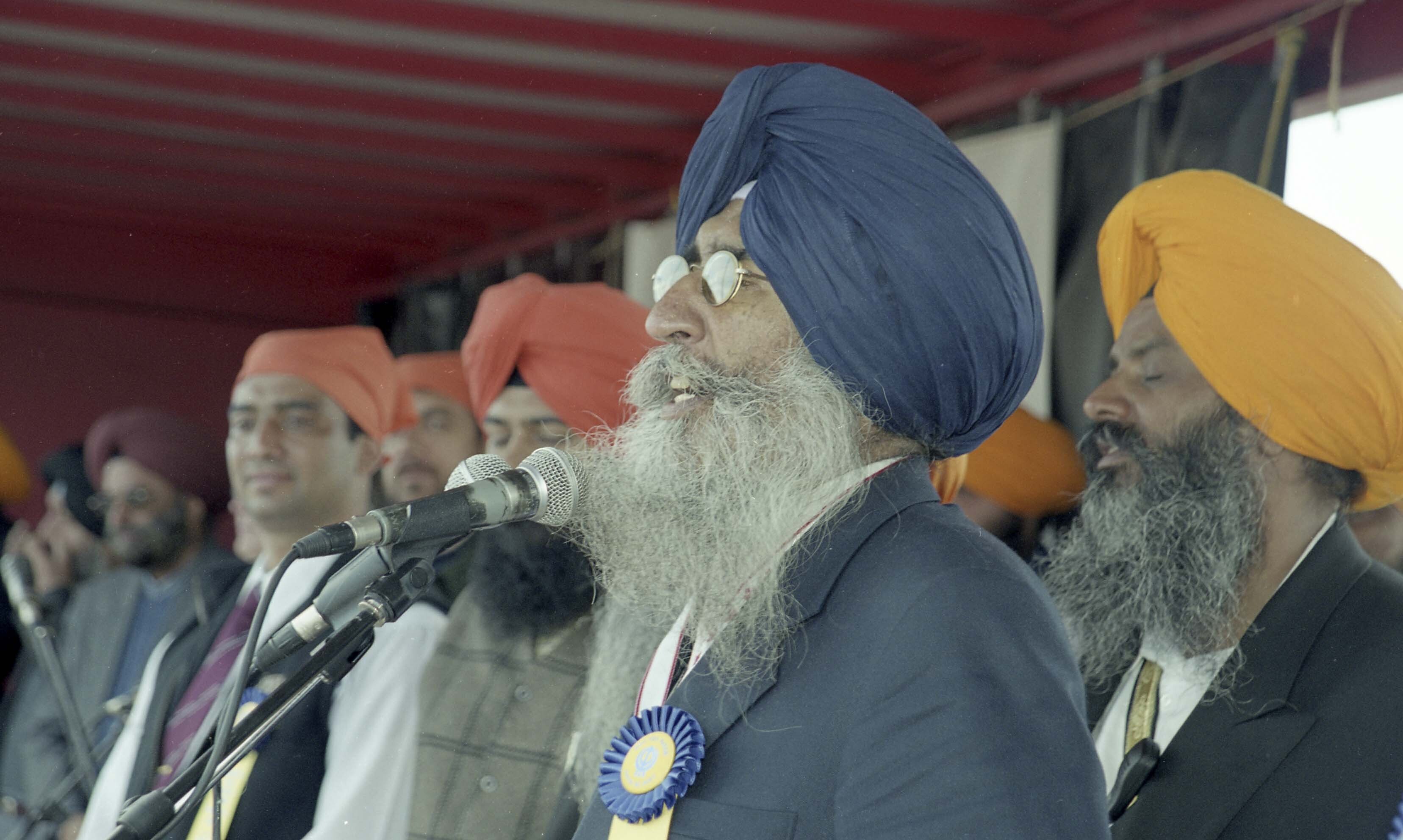 Photograph of an unidentified individual addressing the audience at the Vaisakhi Nagar Kirtan held in Surrey, British Columbia (B.C.).