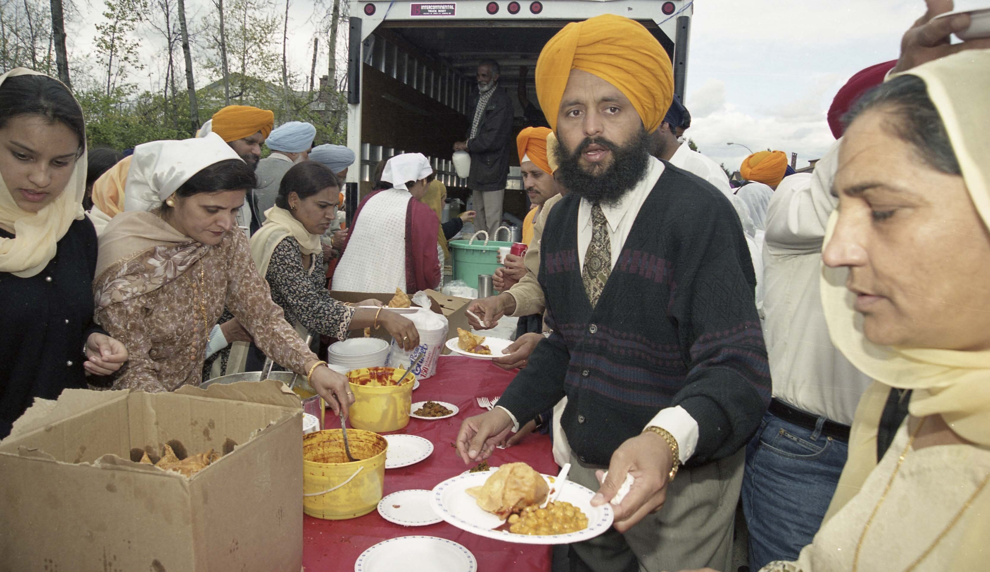 Photograph of a group of unidentified individuals serving food at the Vaisakhi Nagar Kirtan held in Surrey, British Columbia (B.C.).