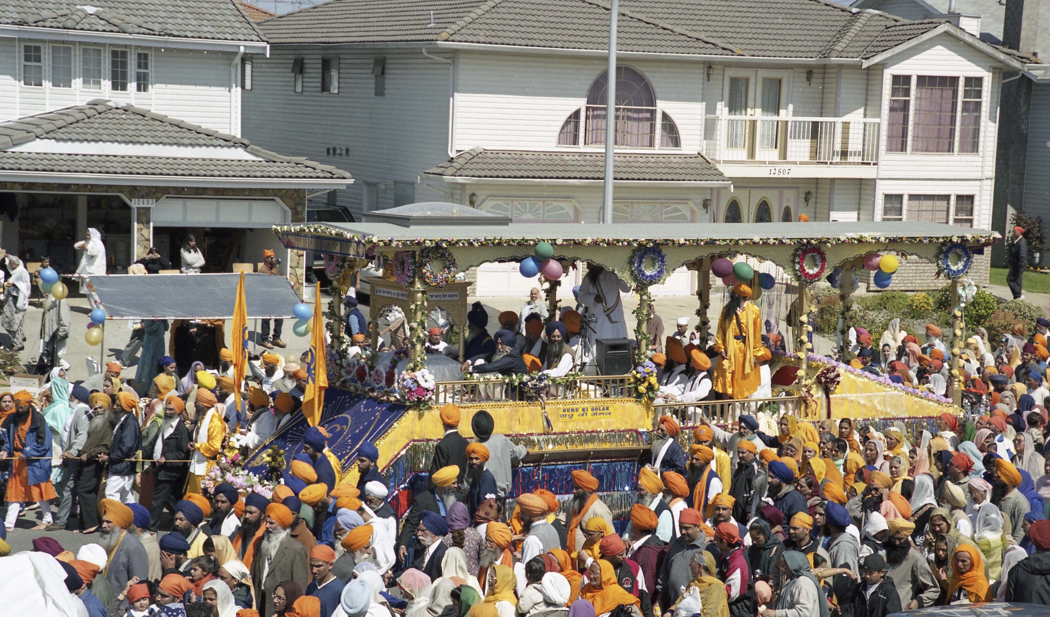 Photograph of a decorated float and a group of unidentified individuals at the Vaisakhi Nagar Kirtan held in Surrey, British Columbia (B.C.).