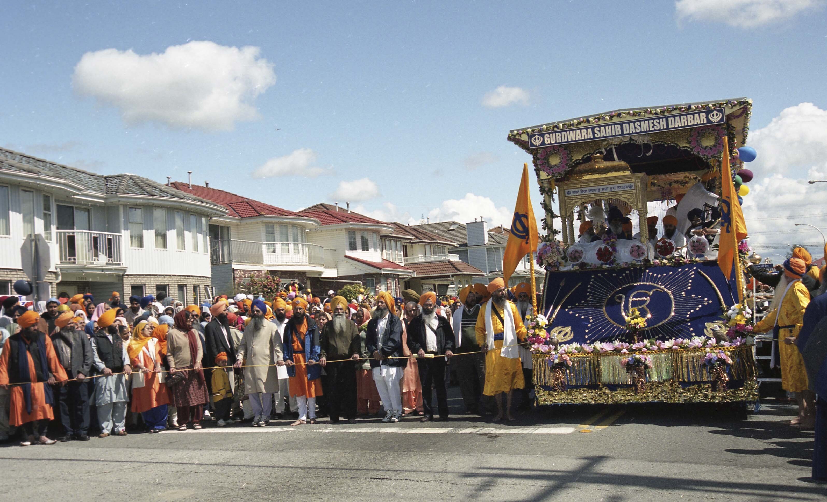 Photograph of a decorated float and a group of unidentified individuals at the Vaisakhi Nagar Kirtan held in Surrey, British Columbia (B.C.).