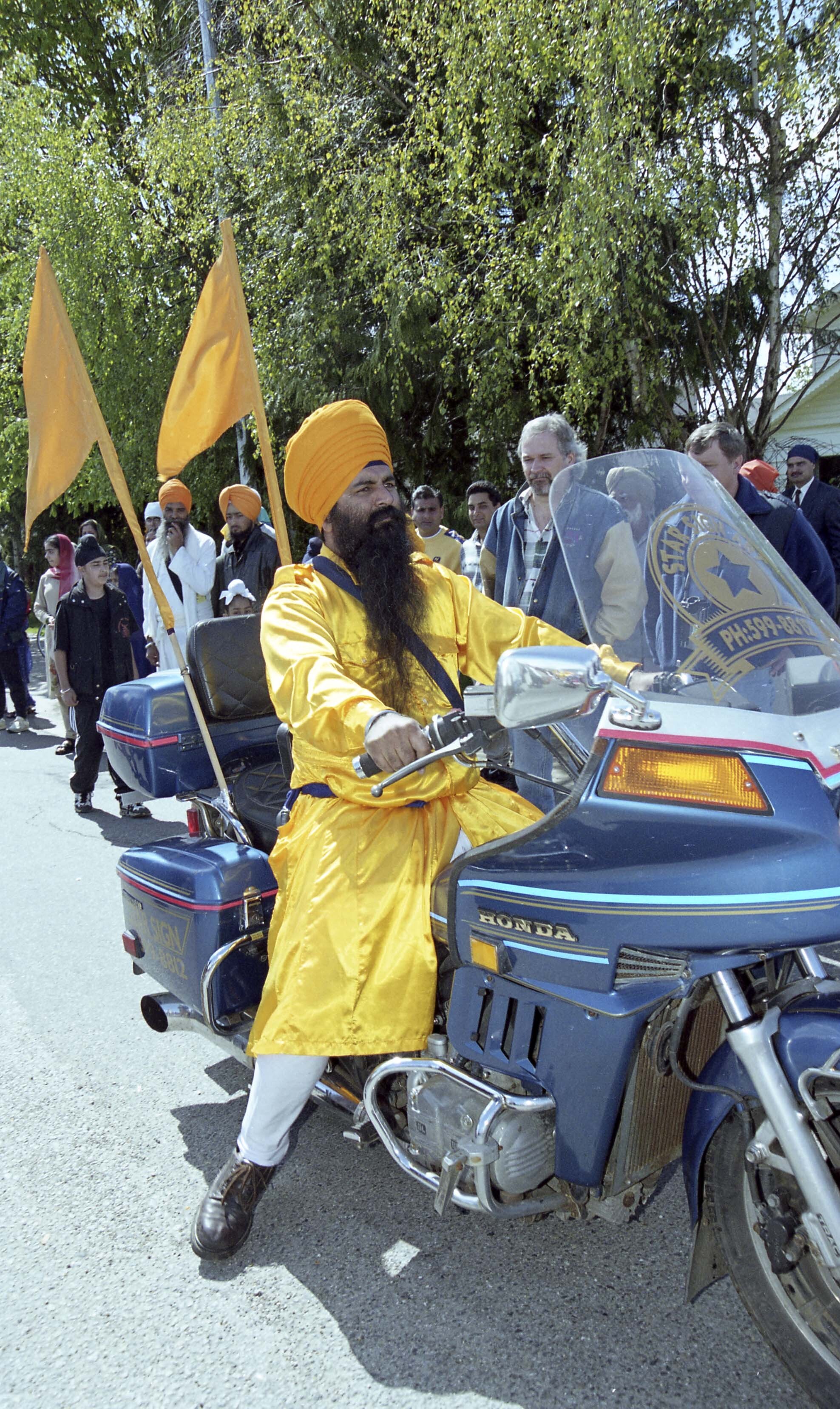 [Photograph of an individual on a motorcycle at the Vaisakhi Nagar Kirtan in Surrey]