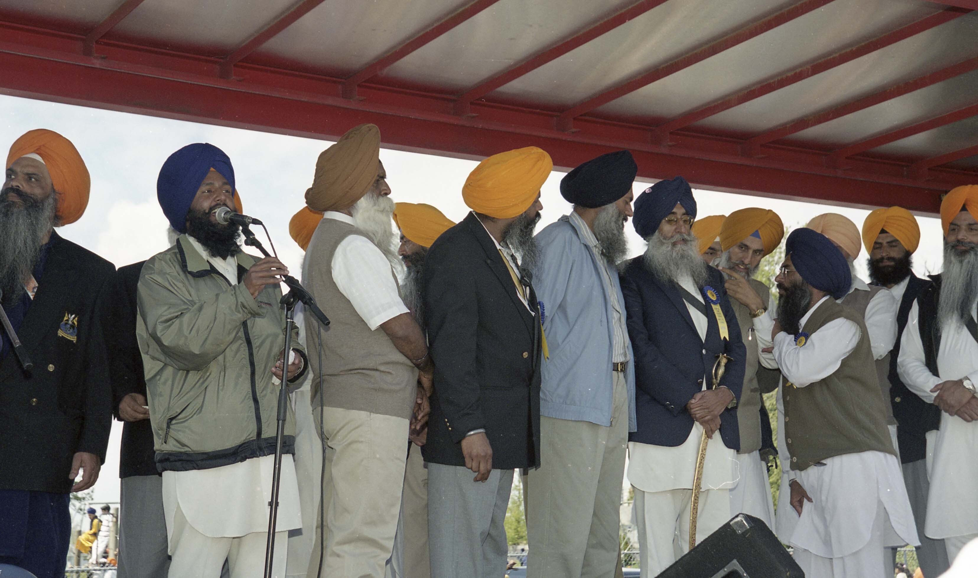 Photograph of a group of unidentified individuals onstage as an unidentified speaker addresses the audience at the Vaisakhi Nagar Kirtan held in Surrey, British Columbia (B.C.).