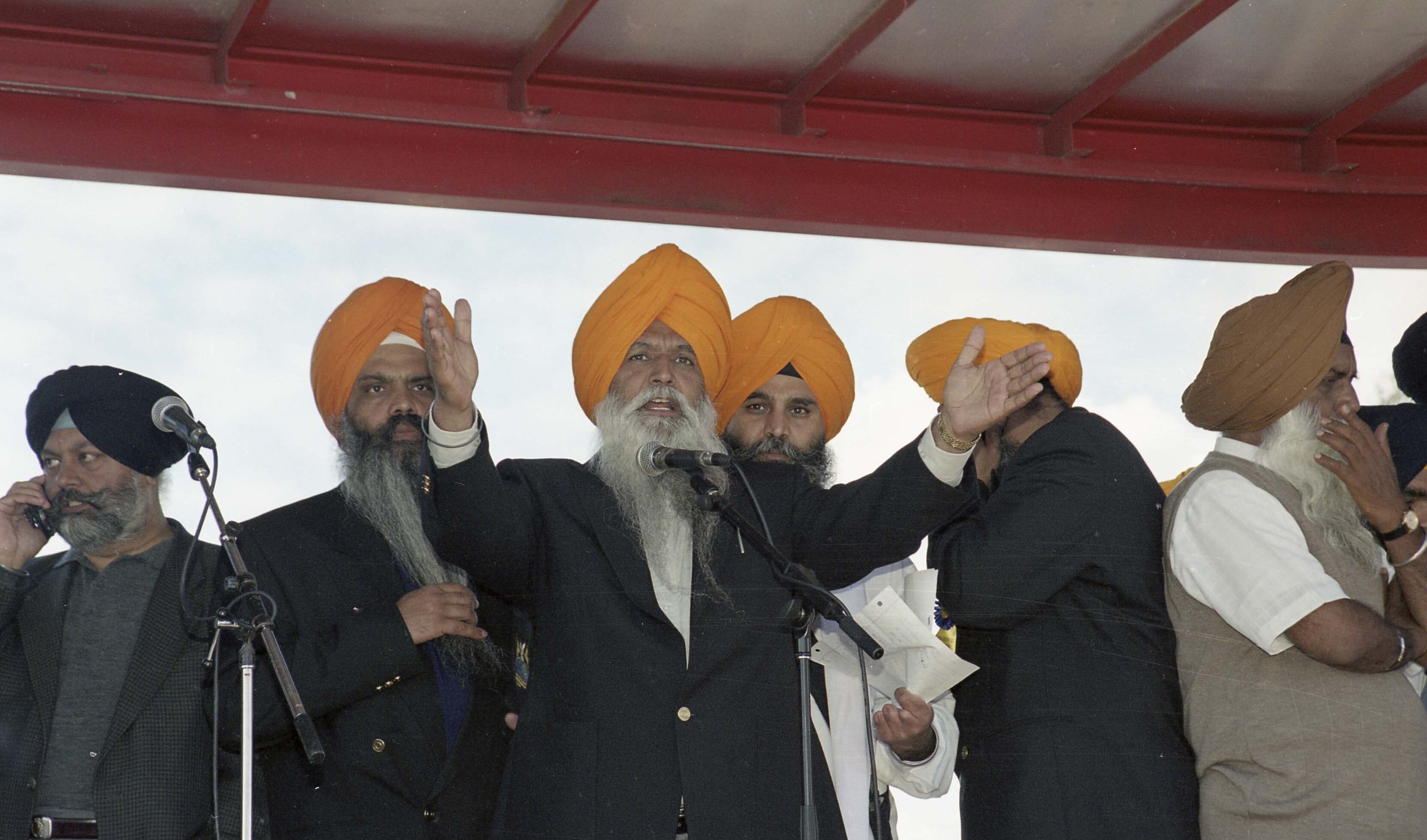 Photograph of a group of unidentified individuals onstage as an unidentified speaker addresses the audience at the Vaisakhi Nagar Kirtan held in Surrey, British Columbia (B.C.).