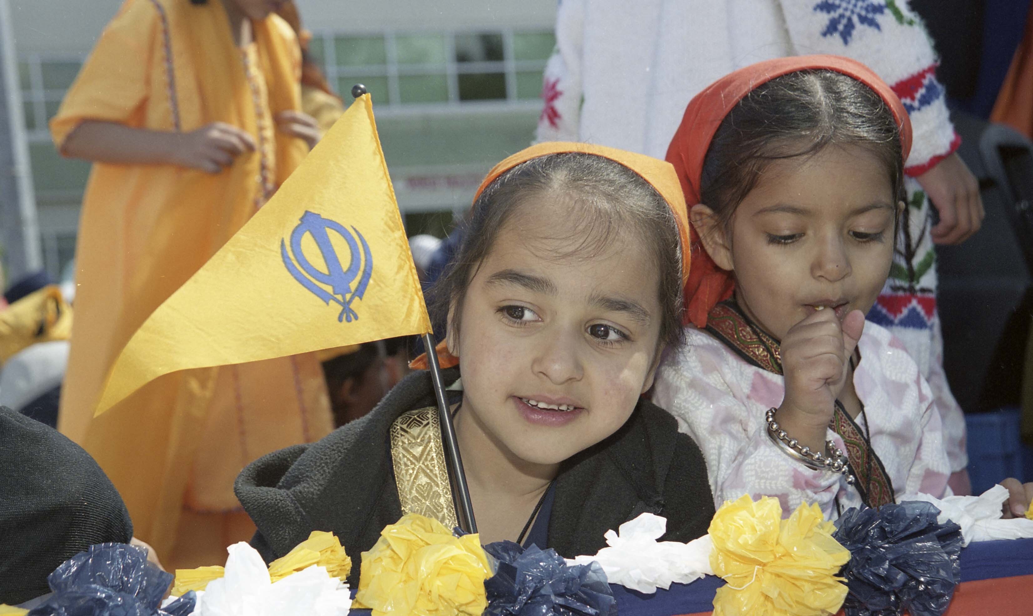 [Photograph of individuals on a float at the Vaisakhi Nagar Kirtan in Surrey]
