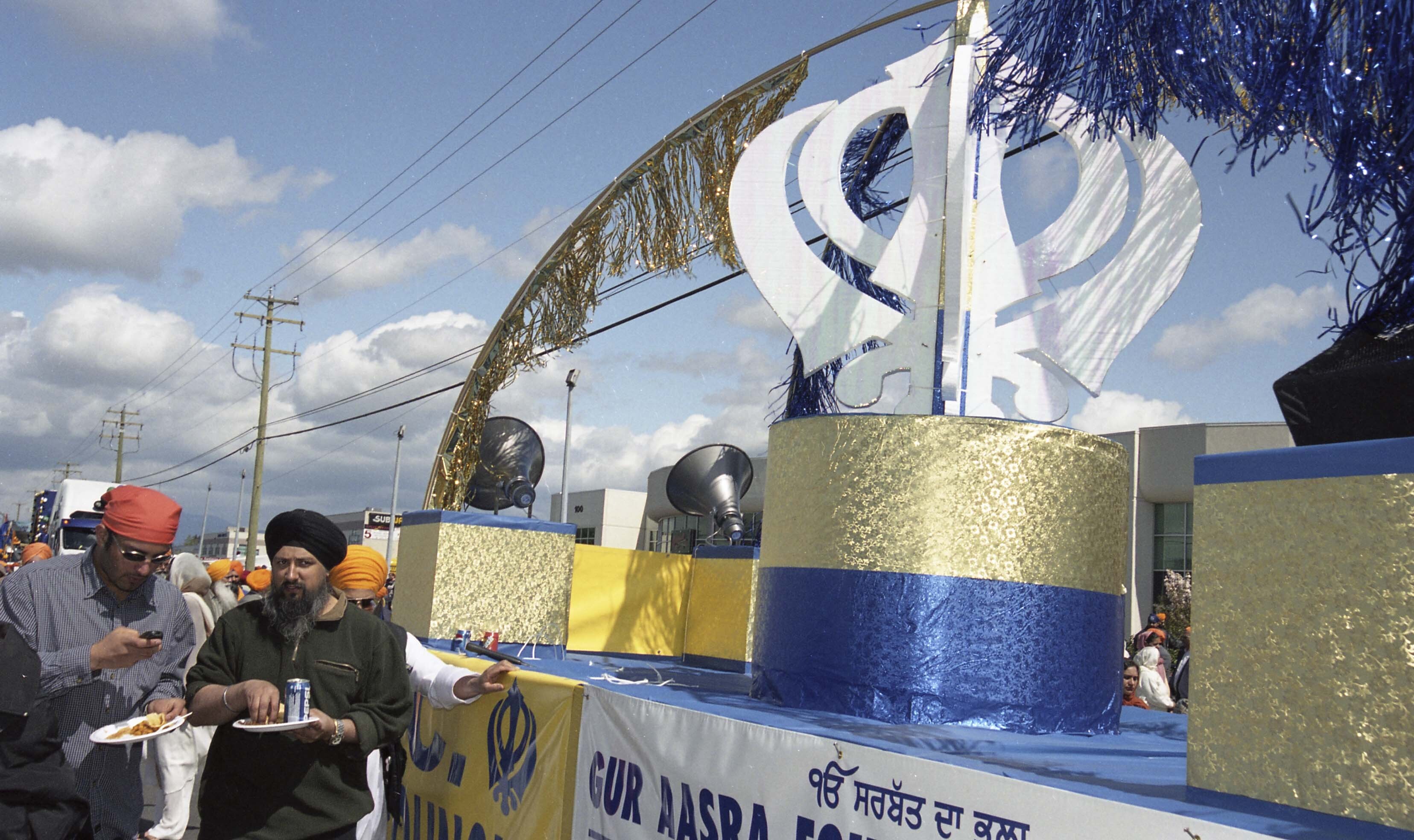 Photograph of unidentified individuals beside a decorated float at the Vaisakhi Nagar Kirtan held in Surrey, British Columbia (B.C.).