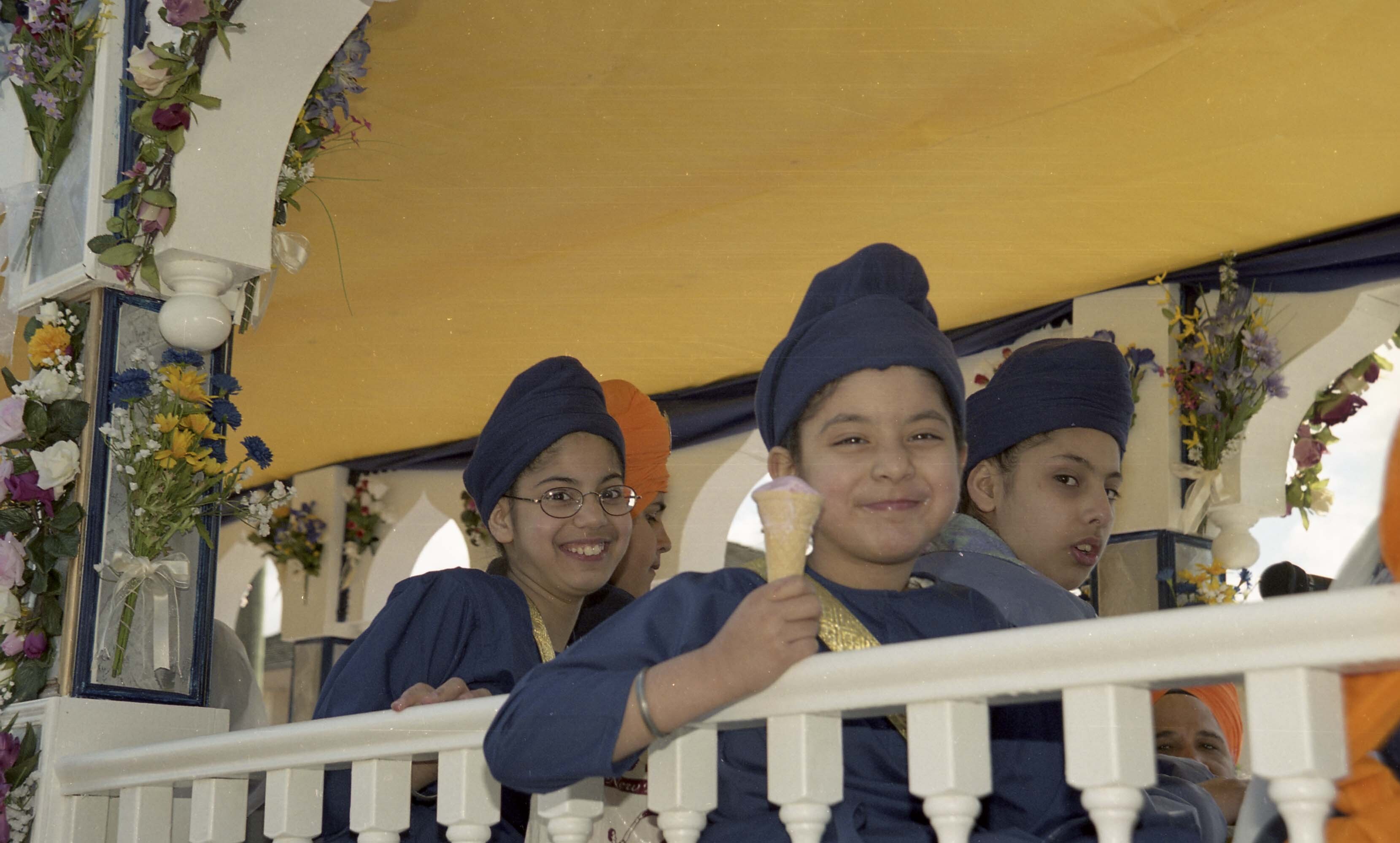 [Photograph of individuals on a float at the Vaisakhi Nagar Kirtan in Surrey]