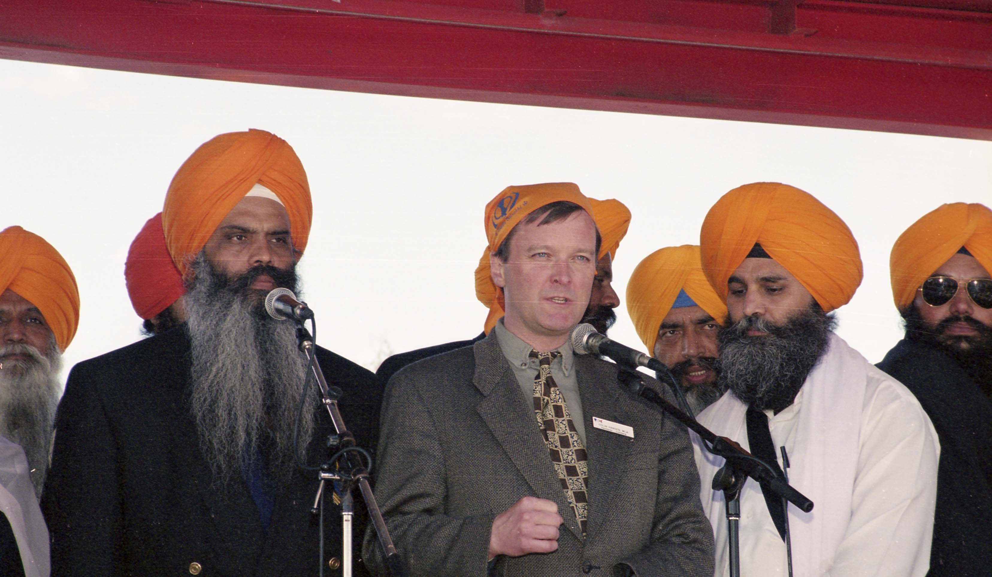 Photograph of a group of unidentified individuals onstage as an unidentified speaker addresses the audience at the Vaisakhi Nagar Kirtan held in Surrey, British Columbia (B.C.).