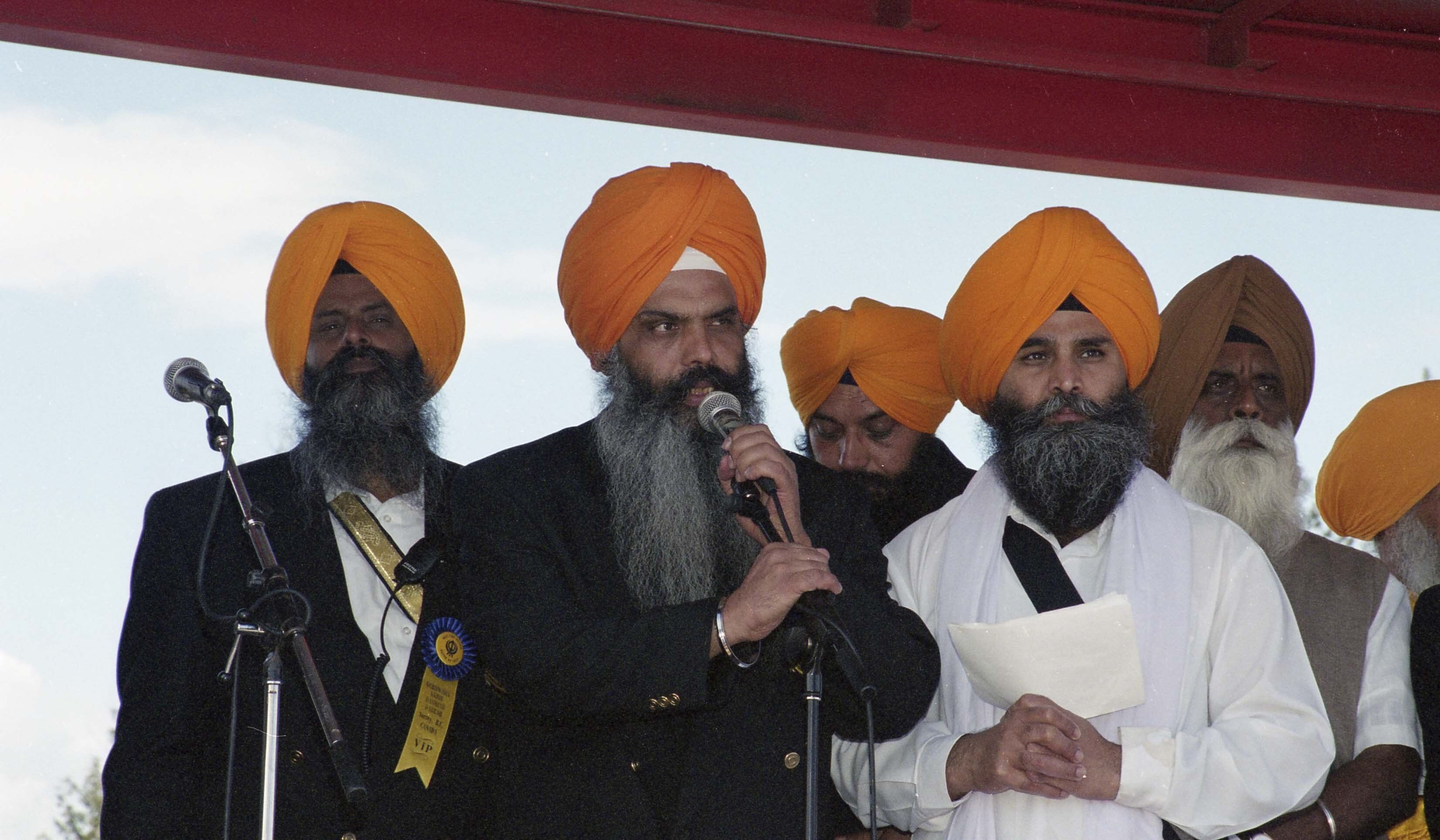 Photograph of a group of unidentified individuals onstage as an unidentified speaker addresses the audience at the Vaisakhi Nagar Kirtan held in Surrey, British Columbia (B.C.).