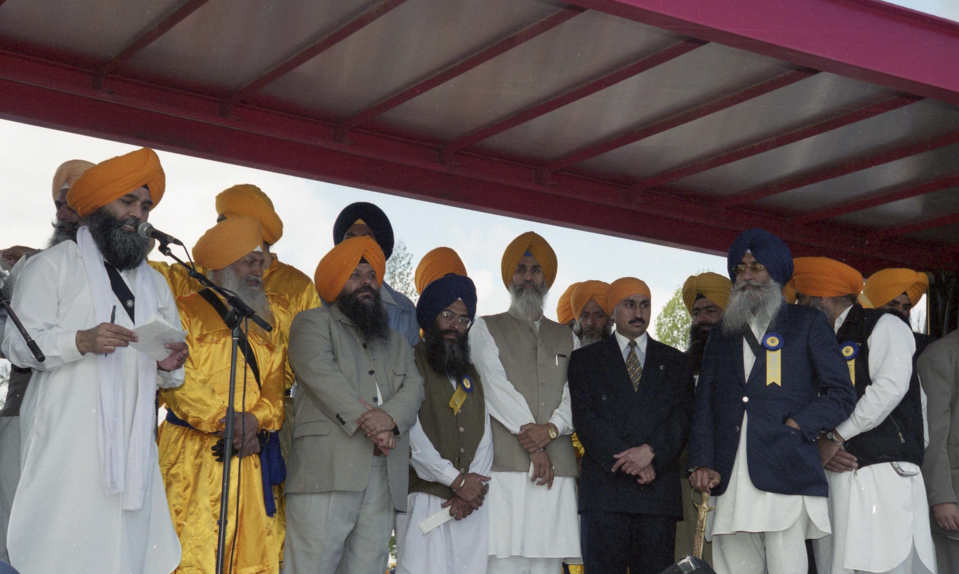 Photograph of a group of unidentified individuals onstage as an unidentified speaker addresses the audience at the Vaisakhi Nagar Kirtan held in Surrey, British Columbia (B.C.).
