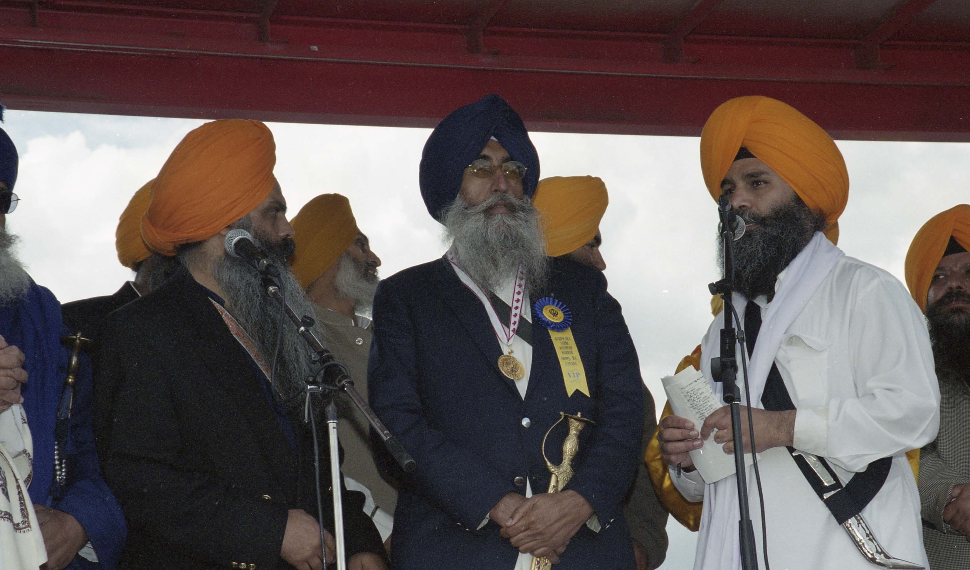 Photograph of a group of unidentified individuals onstage as an unidentified speaker addresses the audience at the Vaisakhi Nagar Kirtan held in Surrey, British Columbia (B.C.).