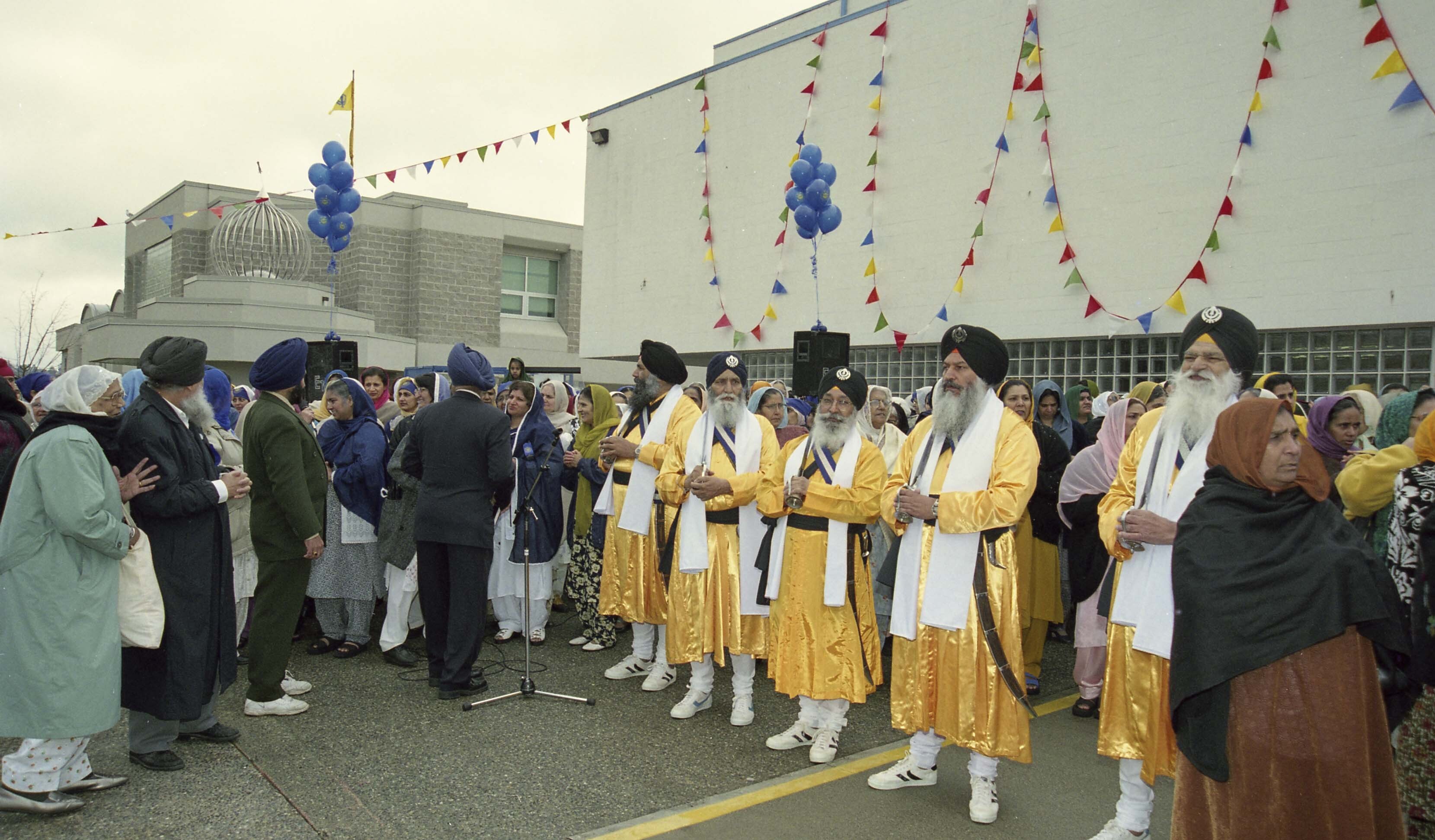 Photograph of a group of unidentified individuals at the Sikh Temple in Vancouver, British Columbia (B.C.). Individuals had gathered at the Sikh Temple for the Vaisakhi Nagar Kirtan, organized by the Khalsa Diwan Society of Vancouver.