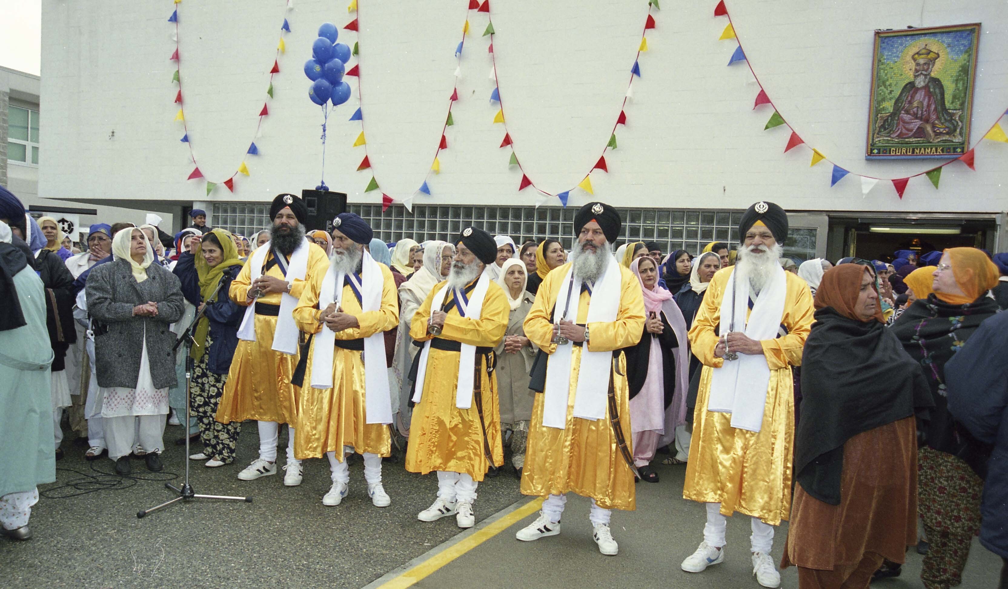 Photograph of a group of unidentified individuals at the Sikh Temple in Vancouver, British Columbia (B.C.). Individuals had gathered at the Sikh Temple for the Vaisakhi Nagar Kirtan, organized by the Khalsa Diwan Society of Vancouver.