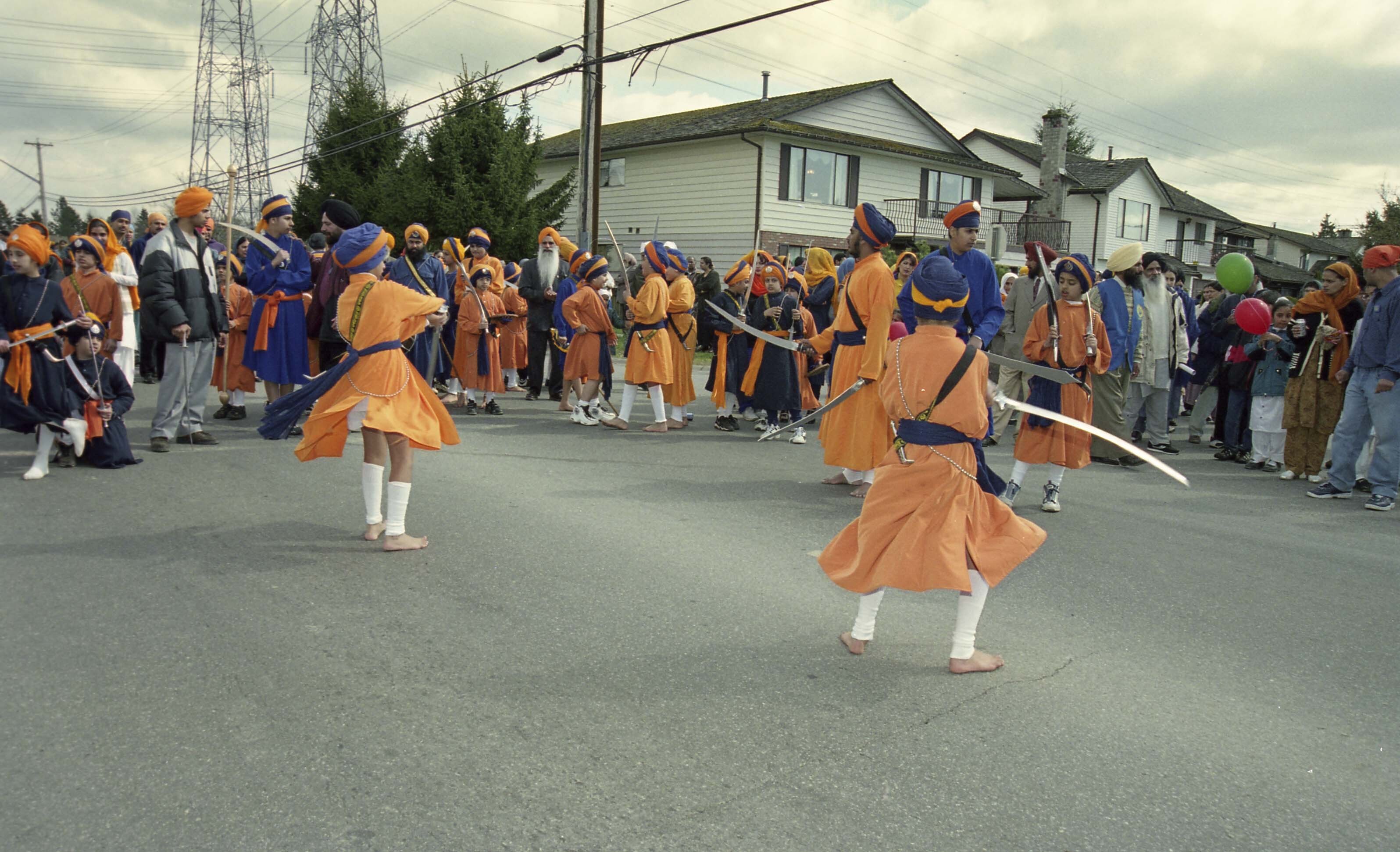 Photograph of a group of unidentified individuals performing gatka at the Vaisakhi Nagar Kirtan held in Surrey, British Columbia (B.C.).