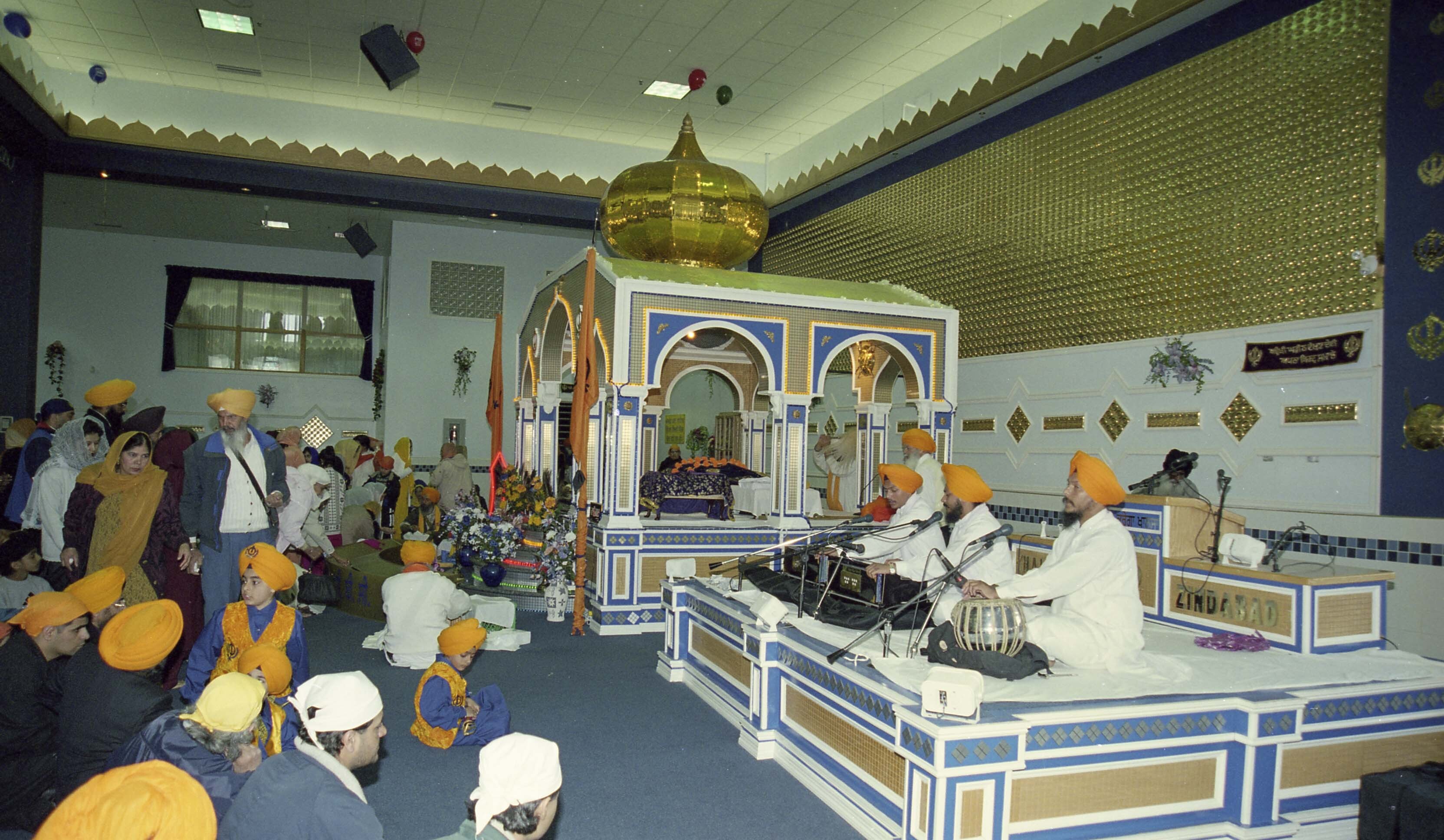 Photograph of unidentified individuals performing kirtan at Gurdwara Sahib Dasmesh Darbar in Surrey, British Columbia (B.C.). Individuals had gathered at the gurdwara (sikh temple) for the Vaisakhi Nagar Kirtan.