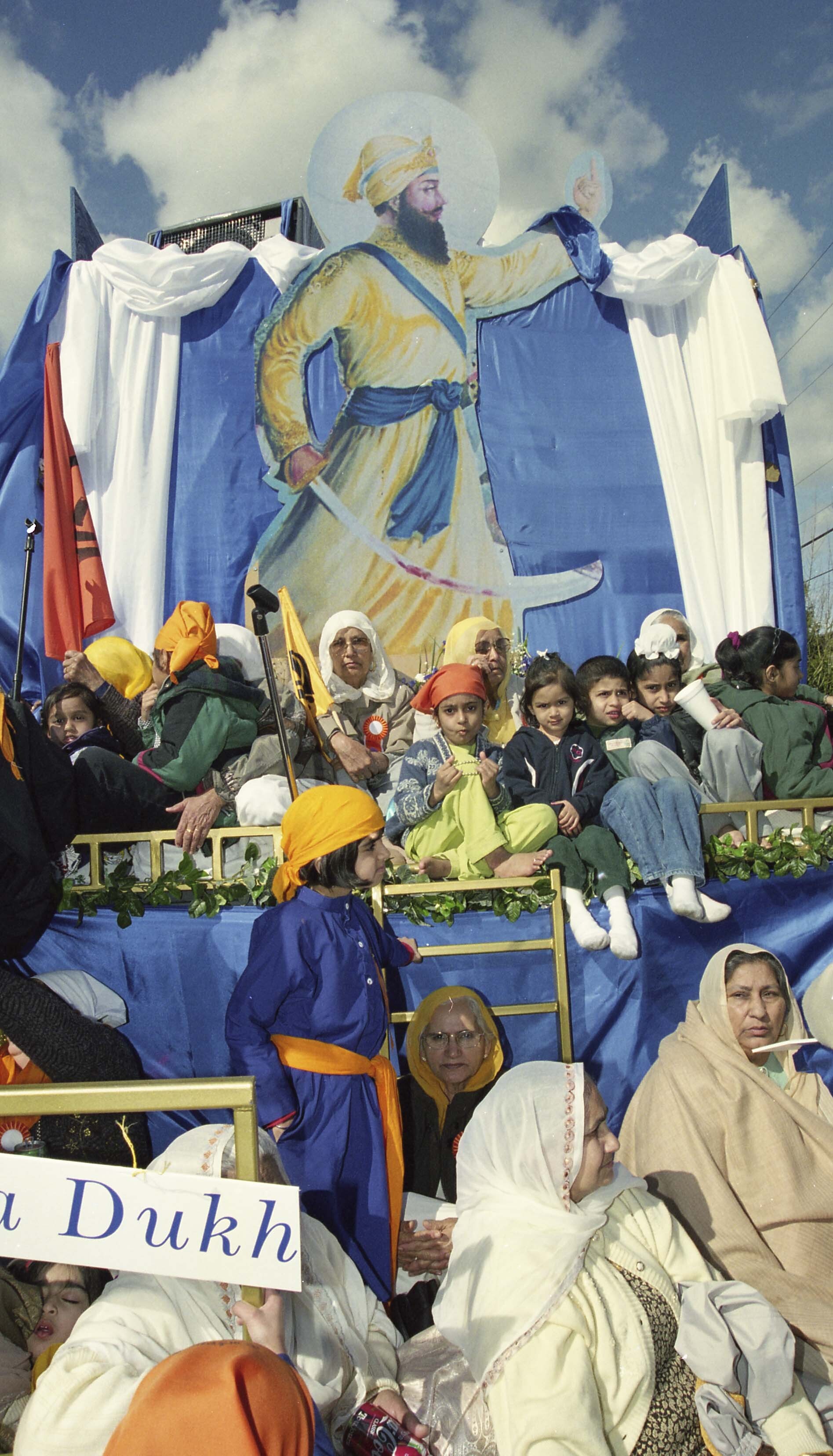 Photograph of a decorated float and a group of unidentified individuals at the Vaisakhi Nagar Kirtan held in Surrey, British Columbia (B.C.).