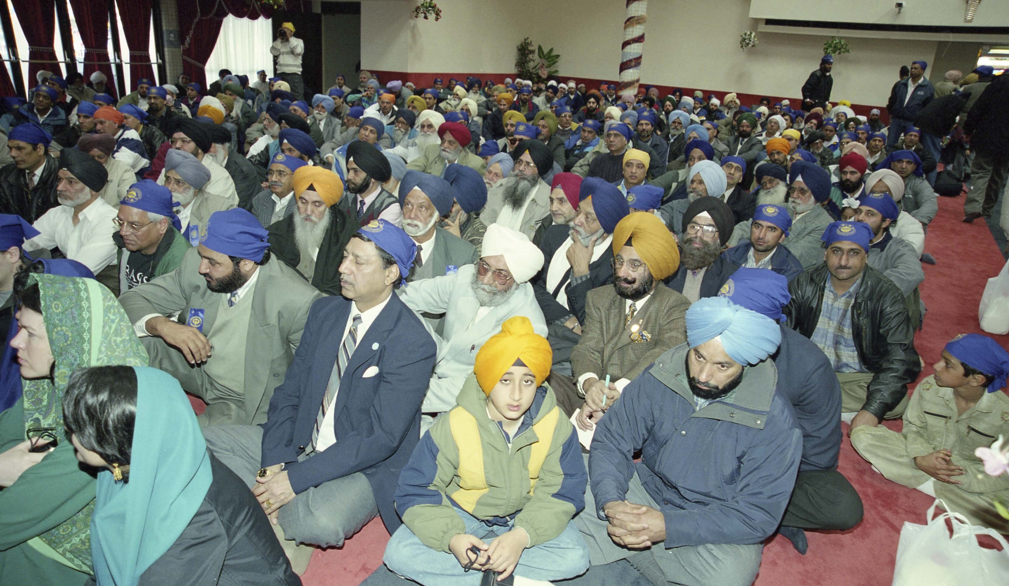 Photograph of a group of unidentified individuals at the Sikh Temple in Vancouver, British Columbia (B.C.). Individuals had gathered at the Sikh Temple for the Vaisakhi Nagar Kirtan, organized by the Khalsa Diwan Society of Vancouver.