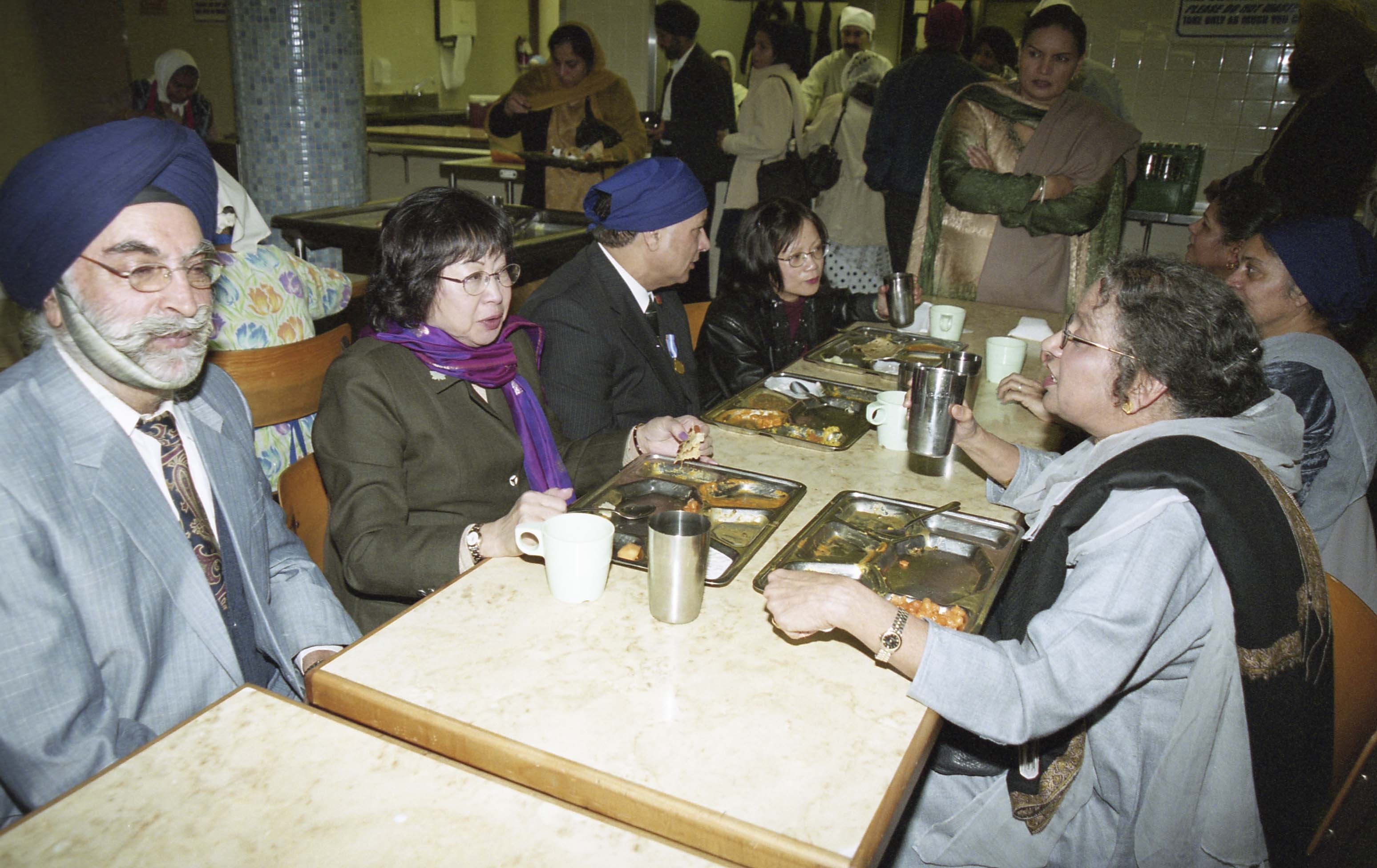 Photograph of a group of unidentified individuals eating langar at the Akali Singh Sikh temple (gurdwara) in Vancouver, British Columbia (B.C.). Among the group are Sophia Leung and Gian Dhesi. Individuals had gathered at the gurdwara (sikh temple) for Queen Elizabeth II's Golden Jubilee Medal Ceremony. Gian Dhesi was the recipient of Queen Elizabeth II's Golden Jubilee Medal for his contributions to Canadian society.