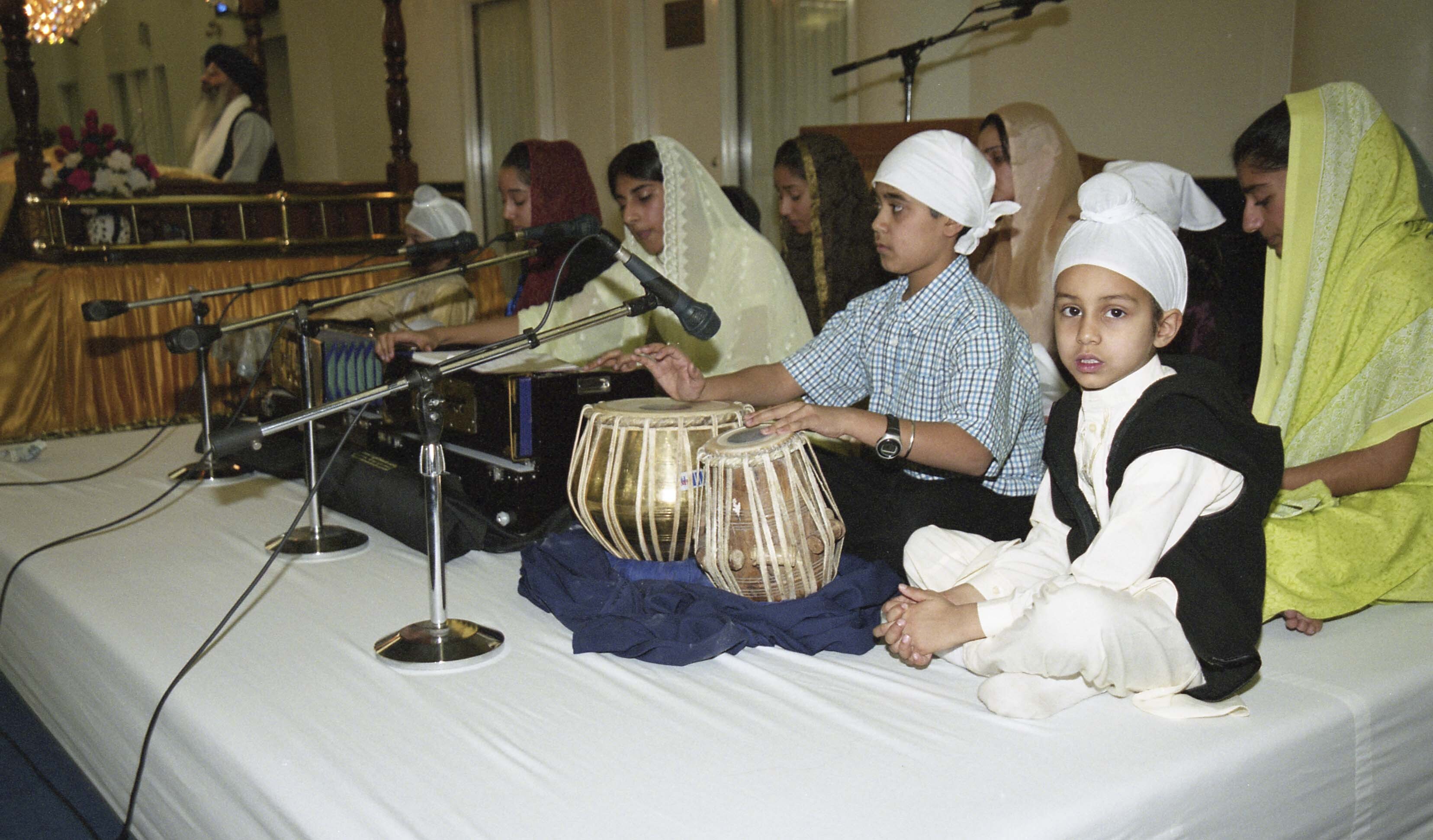 Photograph of a group of unidentified individuals performing kirtan at the Akali Singh Sikh temple (gurdwara) in Vancouver, British Columbia (B.C.). Individuals had gathered at the gurdwara (sikh temple) for Queen Elizabeth II's Golden Jubilee Medal Ceremony. Gian Dhesi was the recipient of Queen Elizabeth II's Golden Jubilee Medal for his contributions to Canadian society.