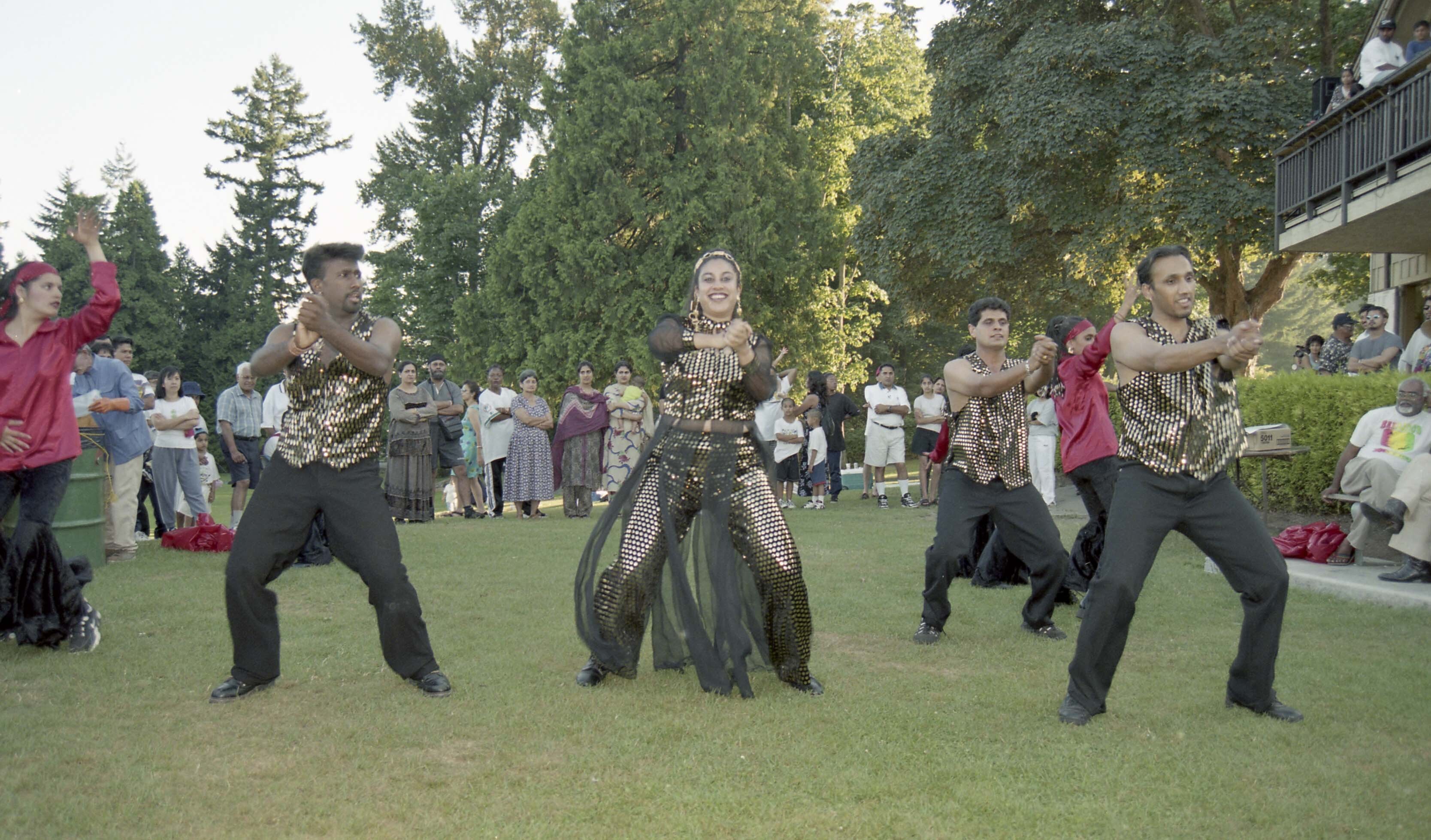 Photograph of a group of unidentified individuals performing a dance routine at Stanley Park in Vancouver, British Columbia (B.C.).
