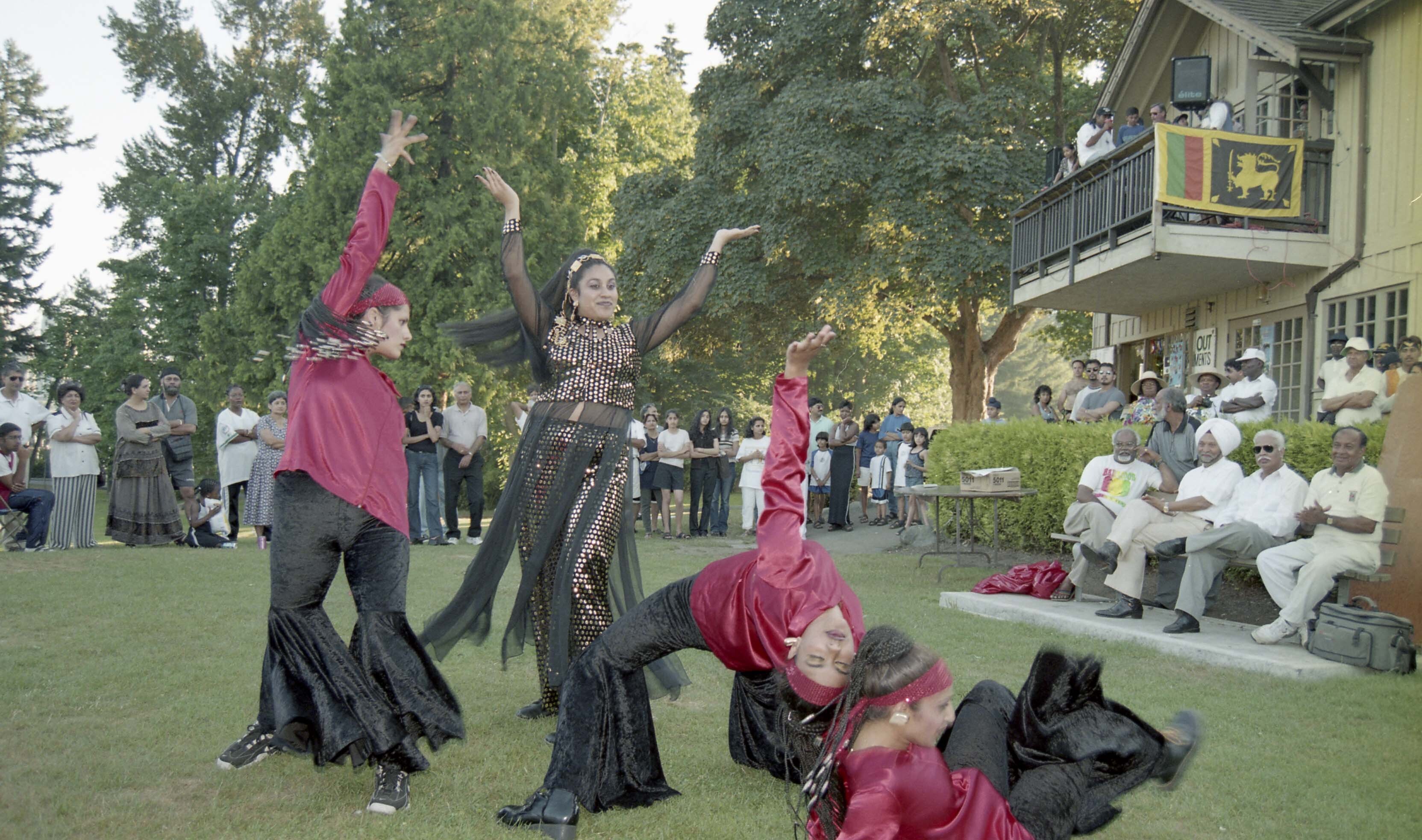 Photograph of a group of unidentified individuals performing a dance routine at Stanley Park in Vancouver, British Columbia (B.C.).