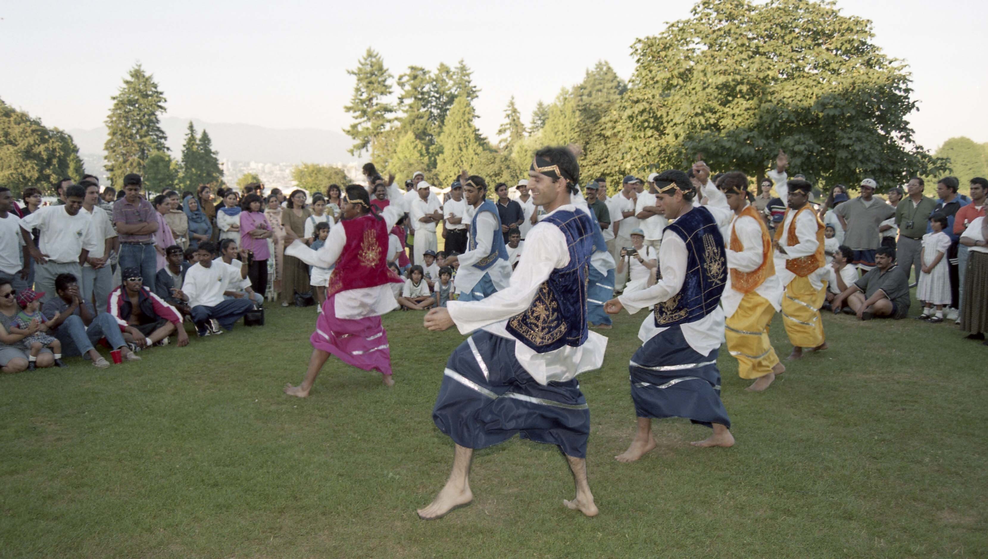 Photograph of a group of unidentified individuals performing bhangra at Stanley Park in Vancouver, British Columbia (B.C.).