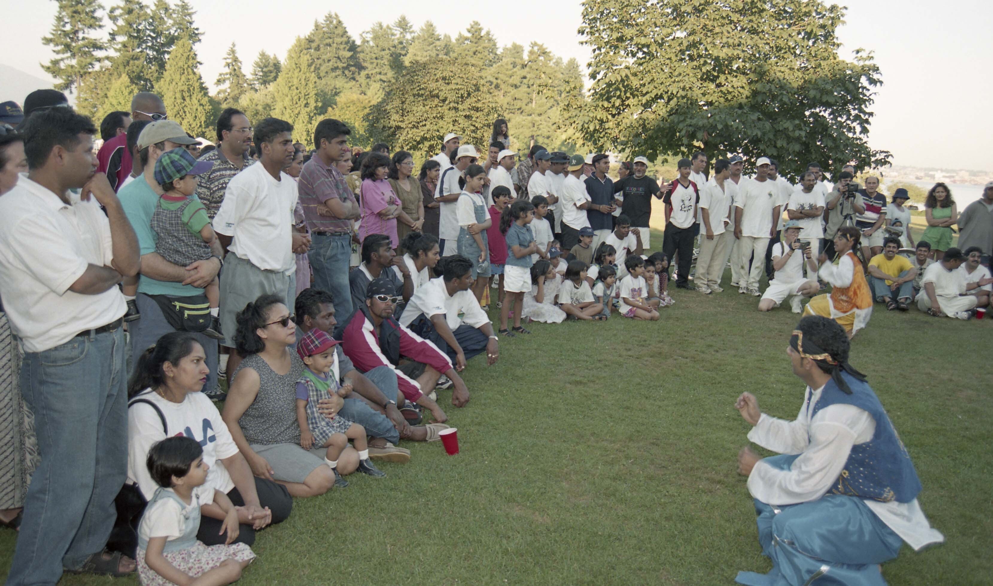 Photograph of unidentified individuals performing bhangra while a group of unidentified individuals watch at Stanley Park in Vancouver, British Columbia (B.C.).