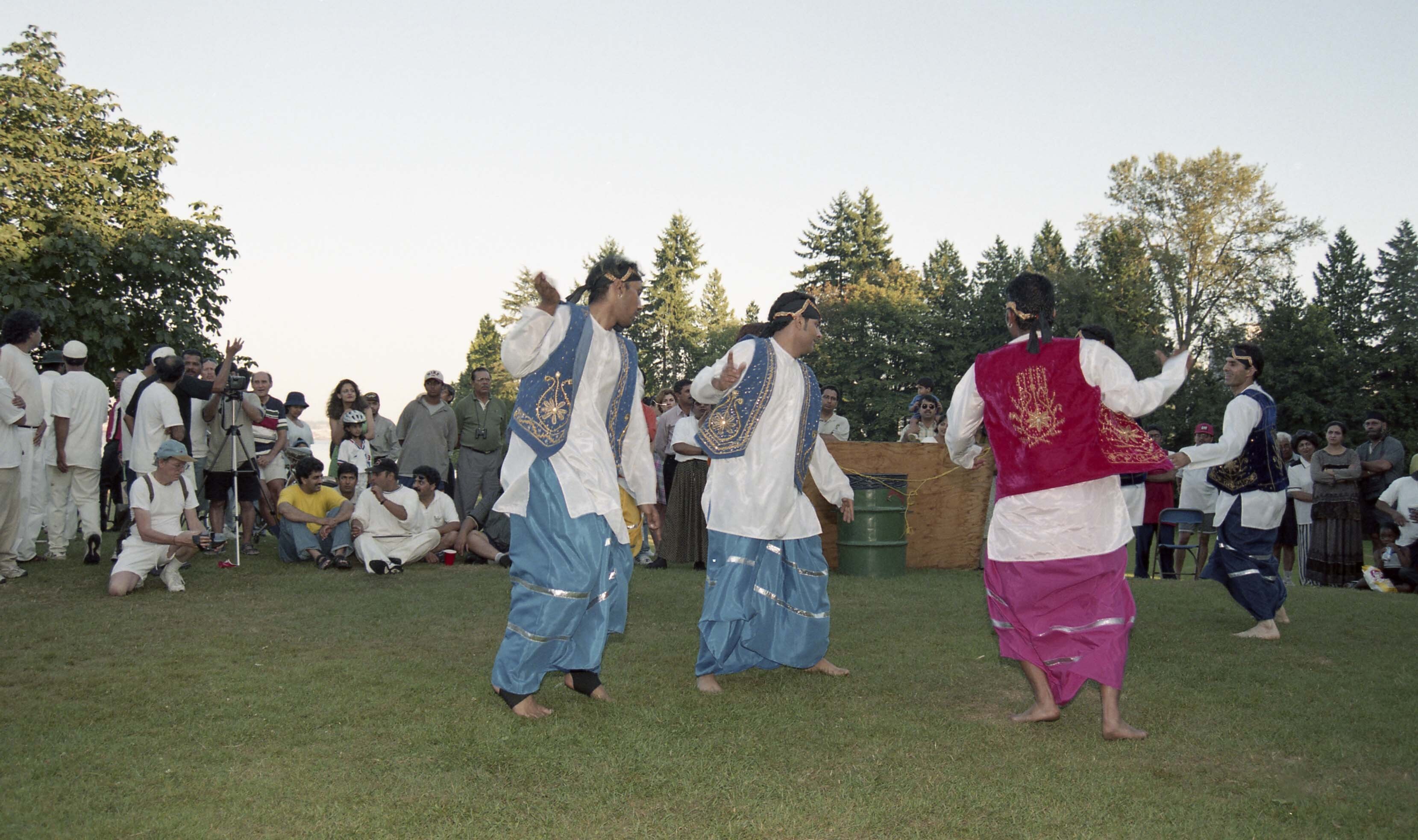 Photograph of a group of unidentified individuals performing bhangra at Stanley Park in Vancouver, British Columbia (B.C.).