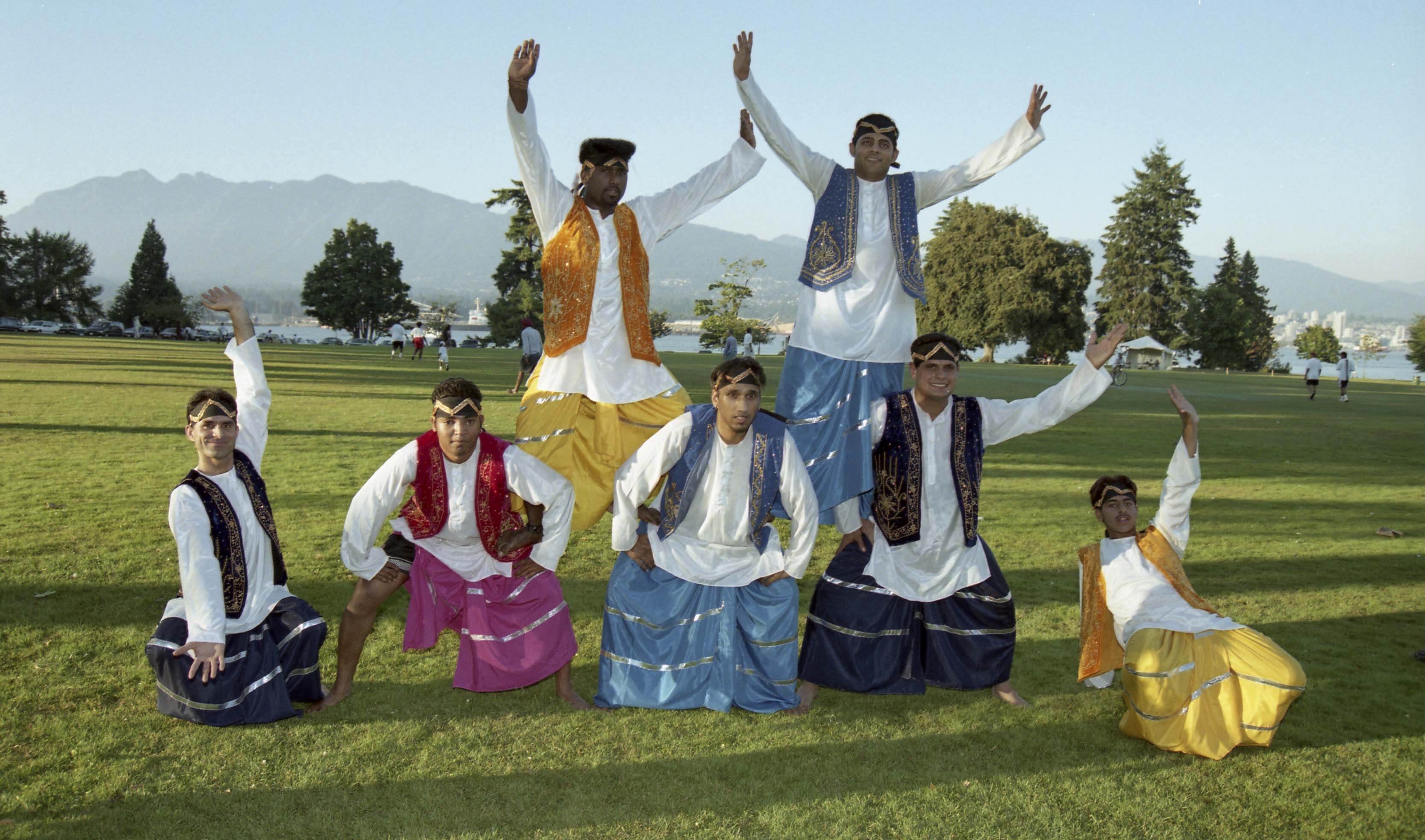 Photograph of a group of unidentified individuals performing bhangra at Stanley Park in Vancouver, British Columbia (B.C.).