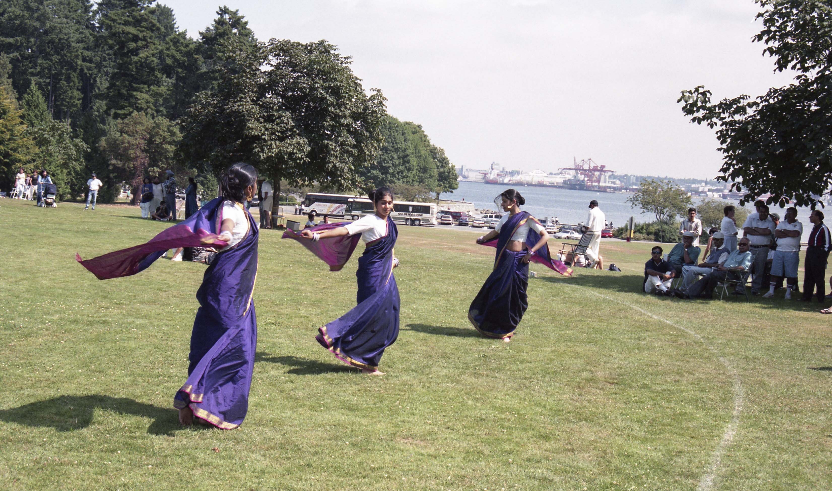 Photograph of unidentified individuals performing a dance routine at Stanley Park in Vancouver, British Columbia (B.C.). Individuals had gathered at Stanley Park for a cricket match.