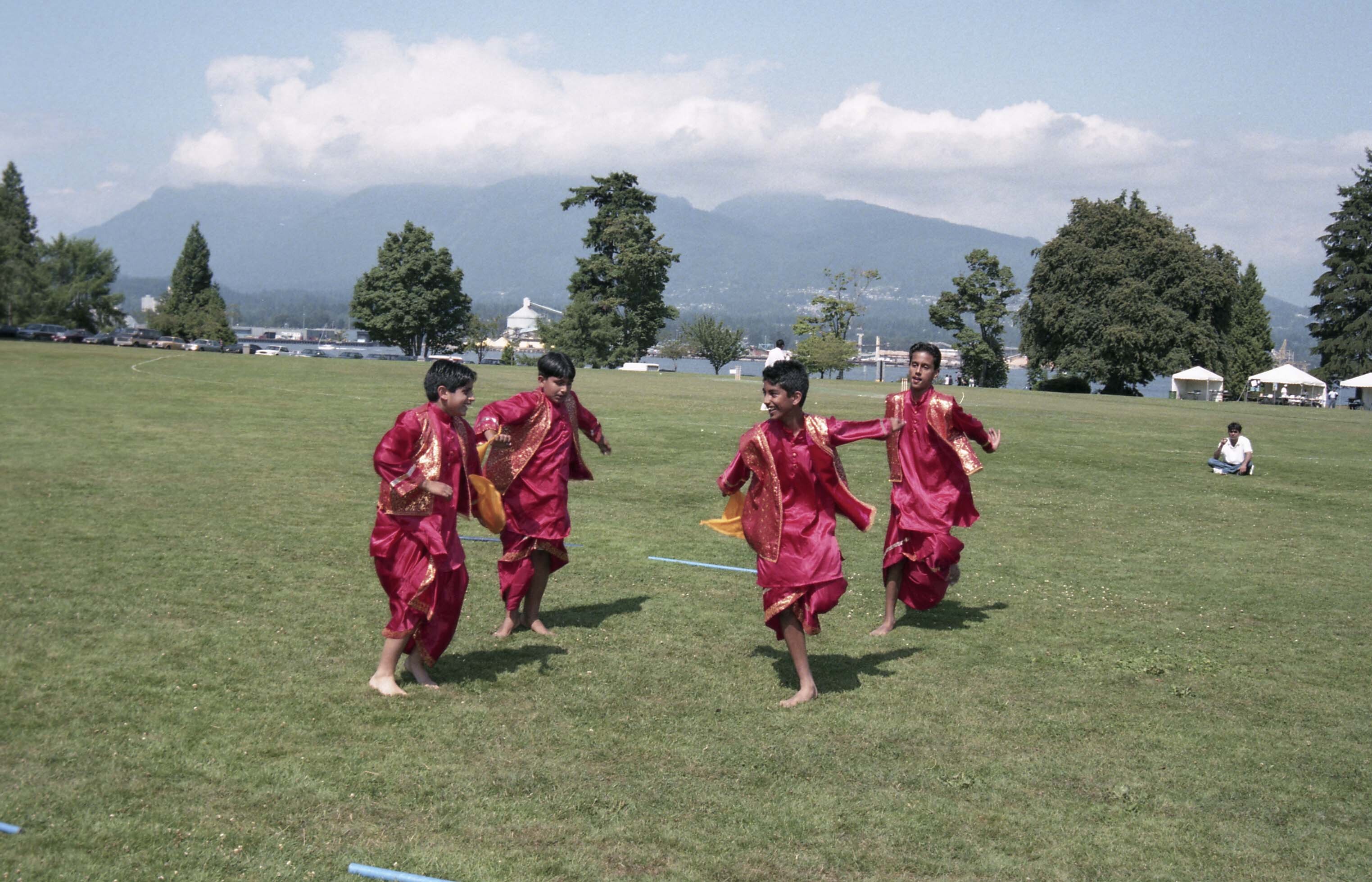 Photograph of a group of unidentified individuals performing bhangra at Stanley Park in Vancouver, British Columbia (B.C.). Individuals had gathered at Stanley Park for a cricket match.