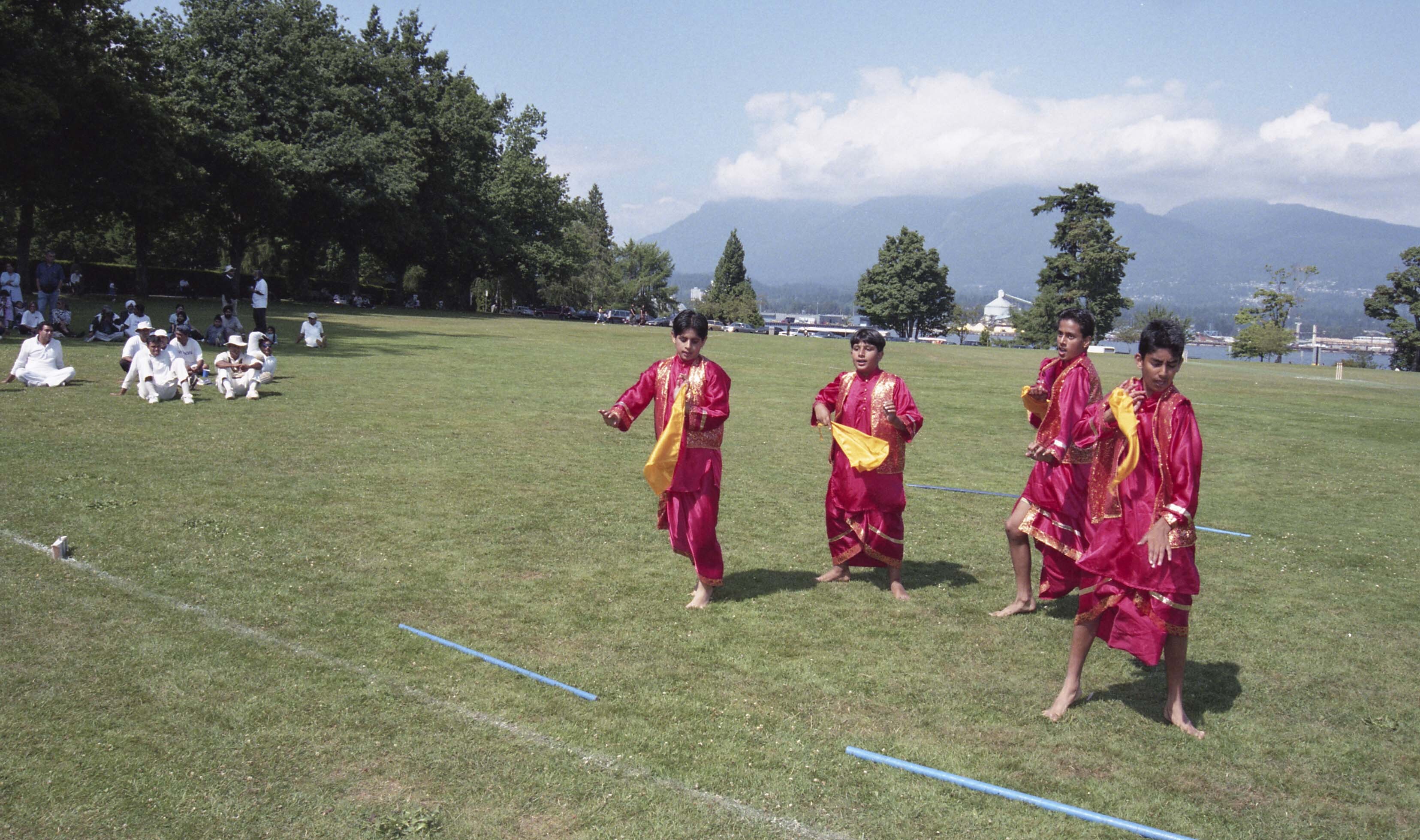 Photograph of a group of unidentified individuals performing bhangra at Stanley Park in Vancouver, British Columbia (B.C.). Individuals had gathered at Stanley Park for a cricket match.