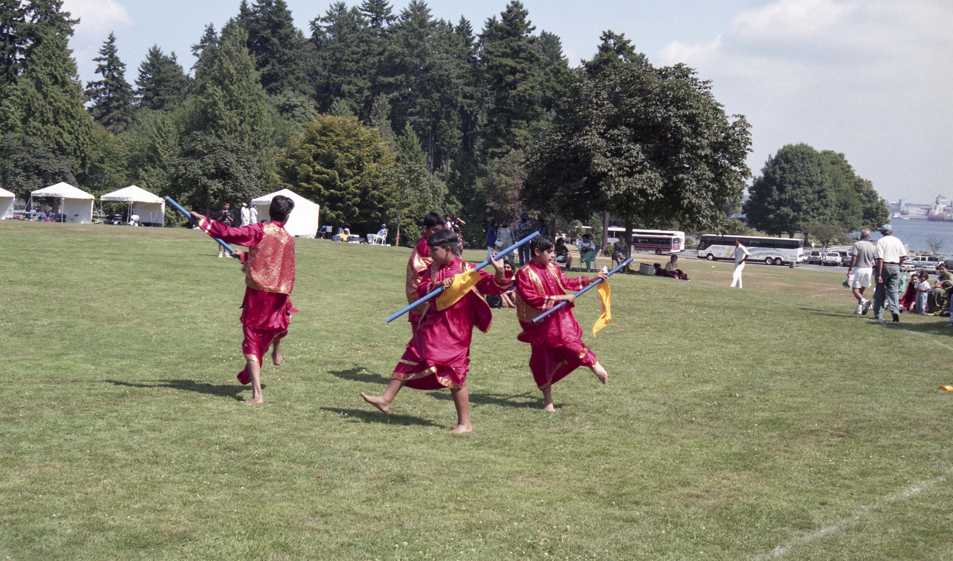 Photograph of a group of unidentified individuals performing bhangra at Stanley Park in Vancouver, British Columbia (B.C.). Individuals had gathered at Stanley Park for a cricket match.