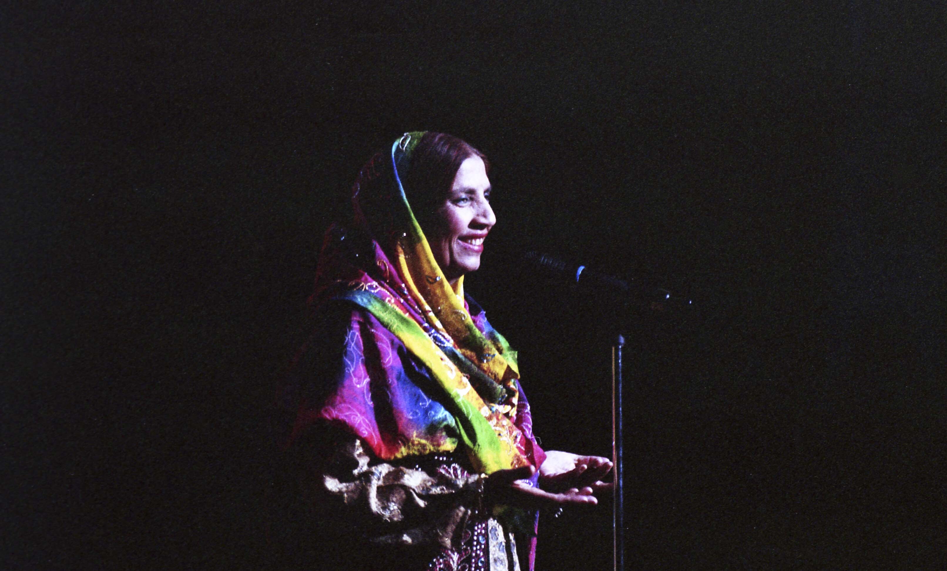 Photograph of Reshma onstage at an indoor venue.