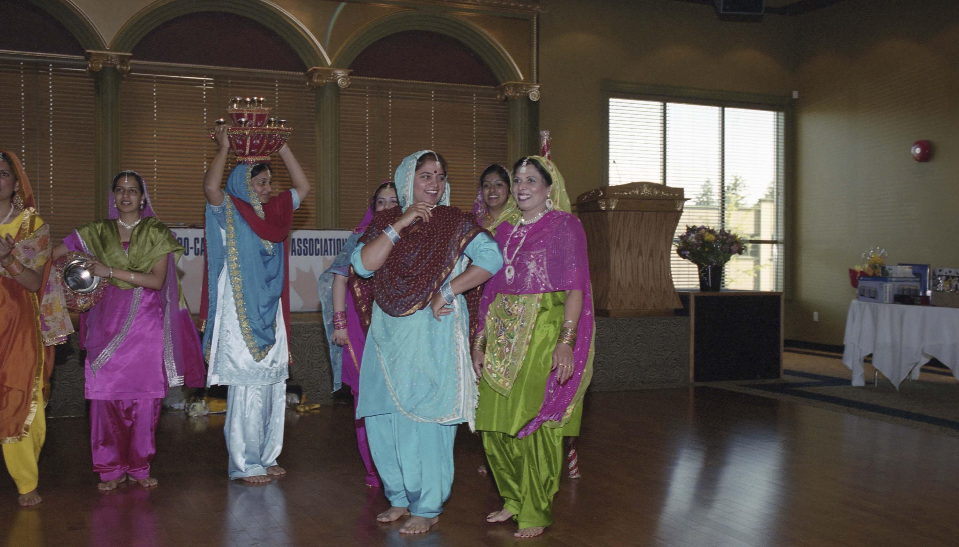 Photograph of a group of unidentified individuals performing giddha and jaggo at the 7th annual Indo-Canadian Business Association (ICBA) Achievement Awards. The event took place at the Crystal at York banquet hall in Surrey, British Columbia (B.C.).