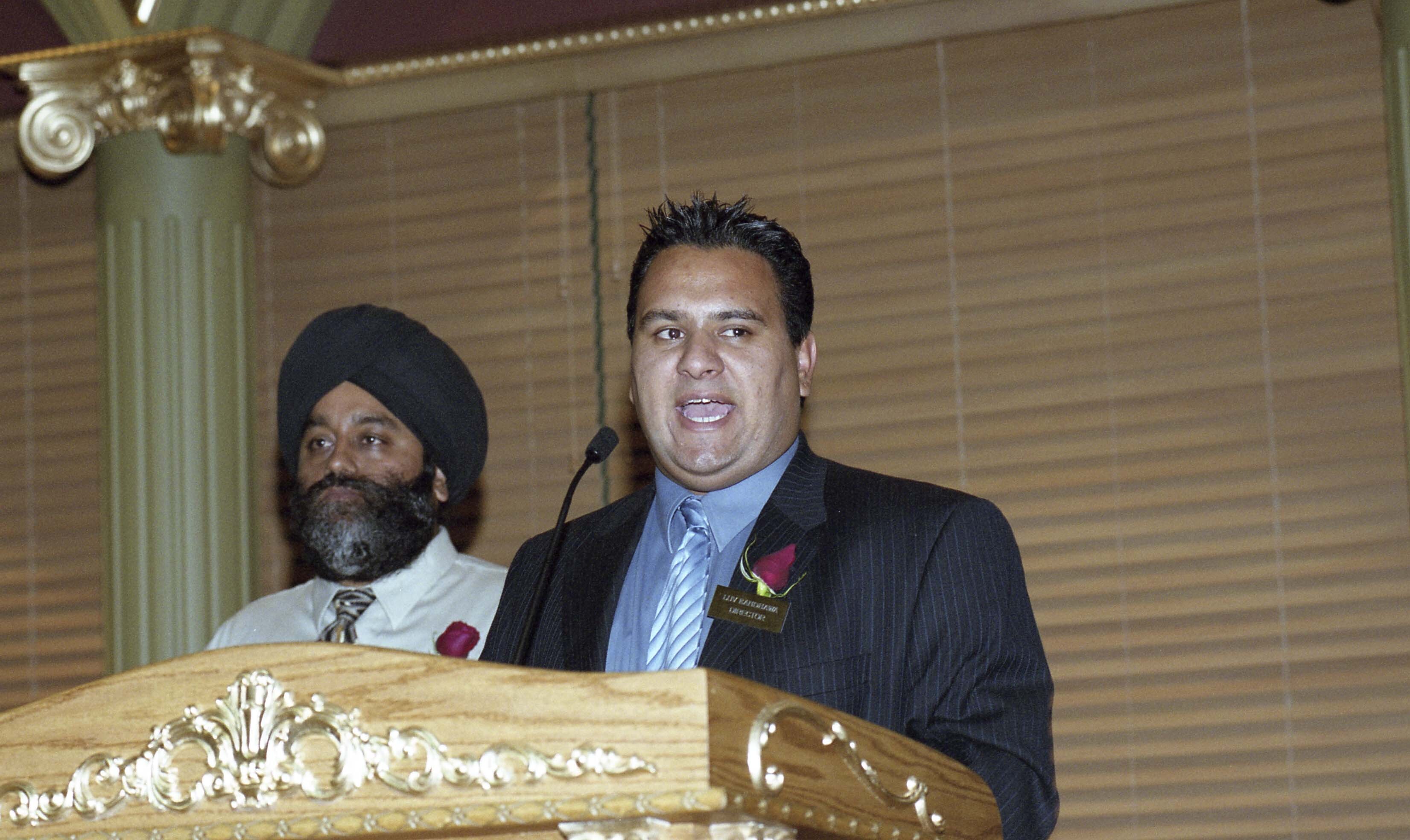 [Photograph of a speaker at the Indo-Canadian Business Association Achievement Awards in Surrey]