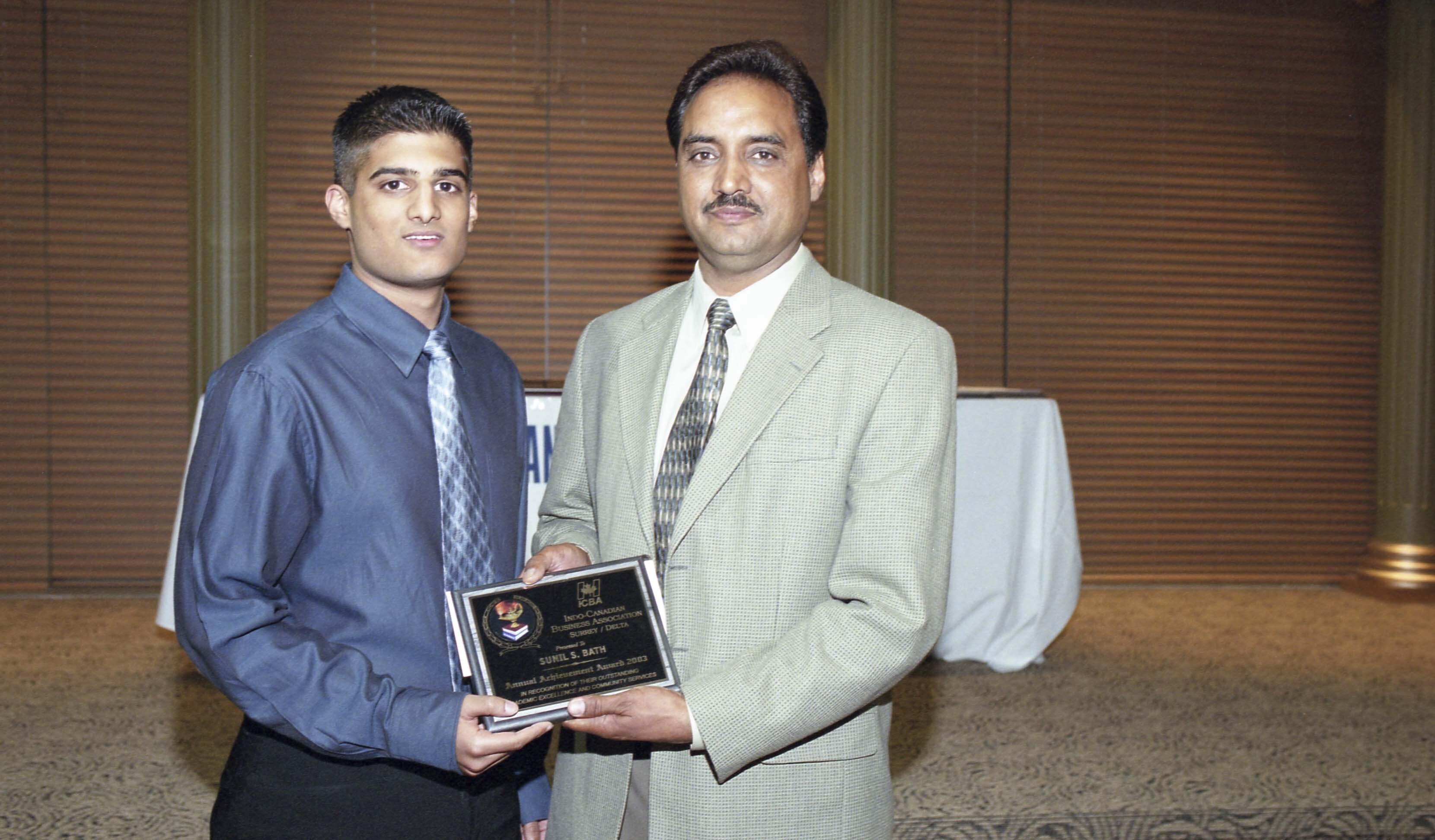Photograph of Amarjit Samra holding an award with an unidentified individual at the 7th annual Indo-Canadian Business Association (ICBA) Achievement Awards. An award was presented to Sunil S. Bath in recognition of their outstanding academic excellence and community services. The event took place at the Crystal at York banquet hall in Surrey, British Columbia (B.C.).