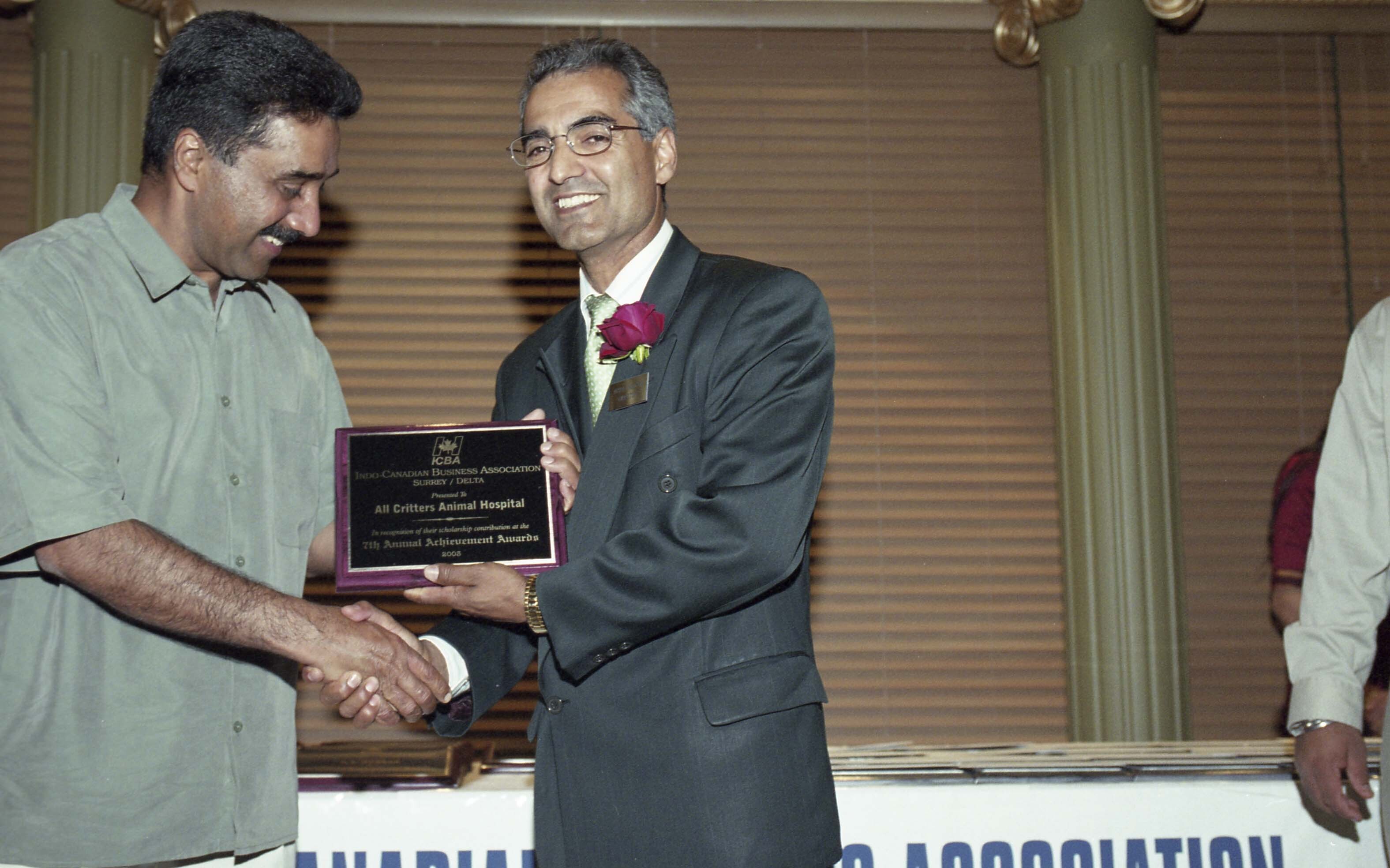 Photograph of unidentified individuals holding an award at the 7th annual Indo-Canadian Business Association (ICBA) Achievement Awards. The award was presented to All Critters Animal Hospital in recognition of their scholarship contribution at the Achievement Awards. The event took place at the Crystal at York banquet hall in Surrey, British Columbia (B.C.).