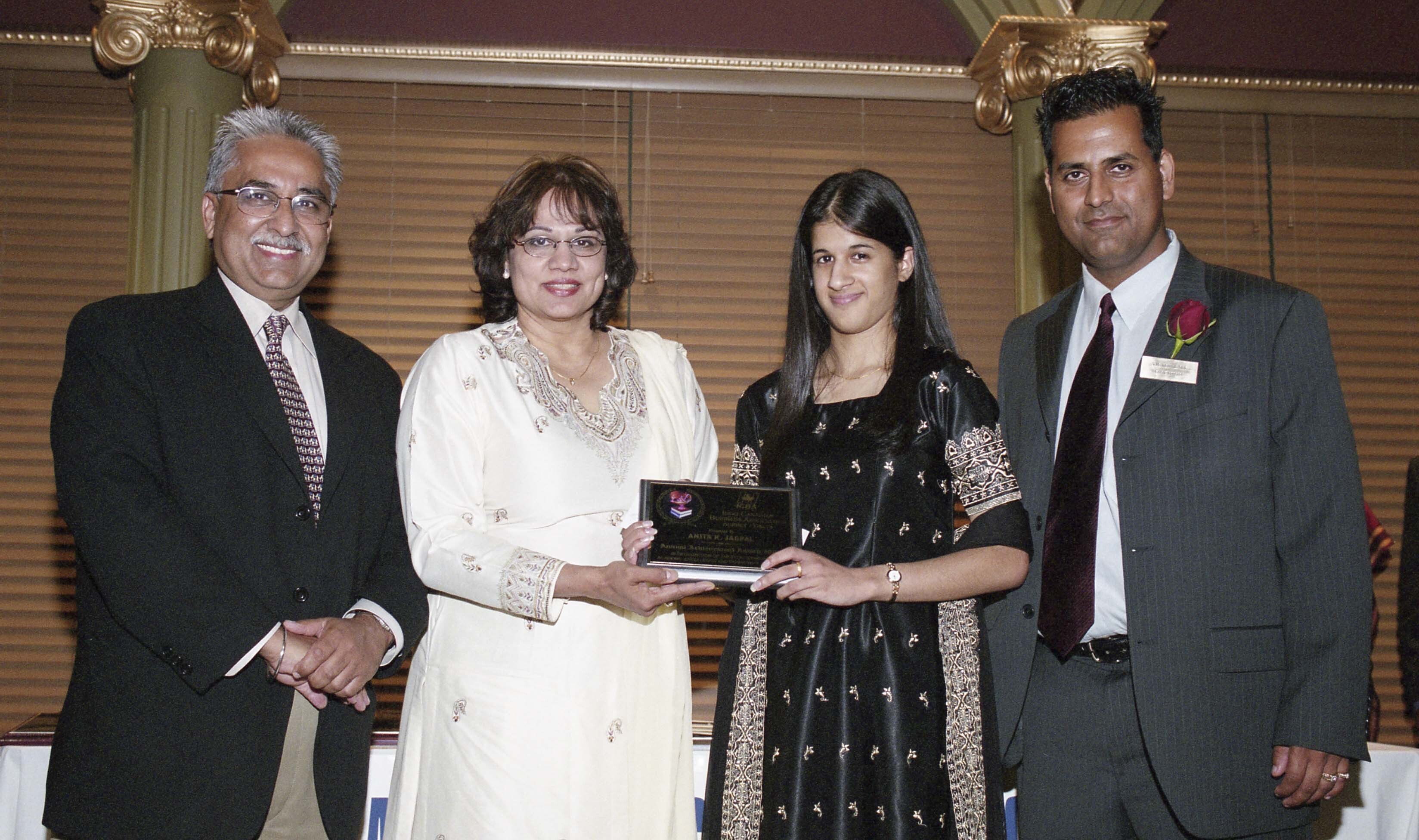 Photograph of a group of unidentified individuals with an award at the 7th annual Indo-Canadian Business Association (ICBA) Achievement Awards. The award was presented to Anita K. Jagpal in recognition of their outstanding academic excellence and community services[?]. The event took place at the Crystal at York banquet hall in Surrey, British Columbia (B.C.).