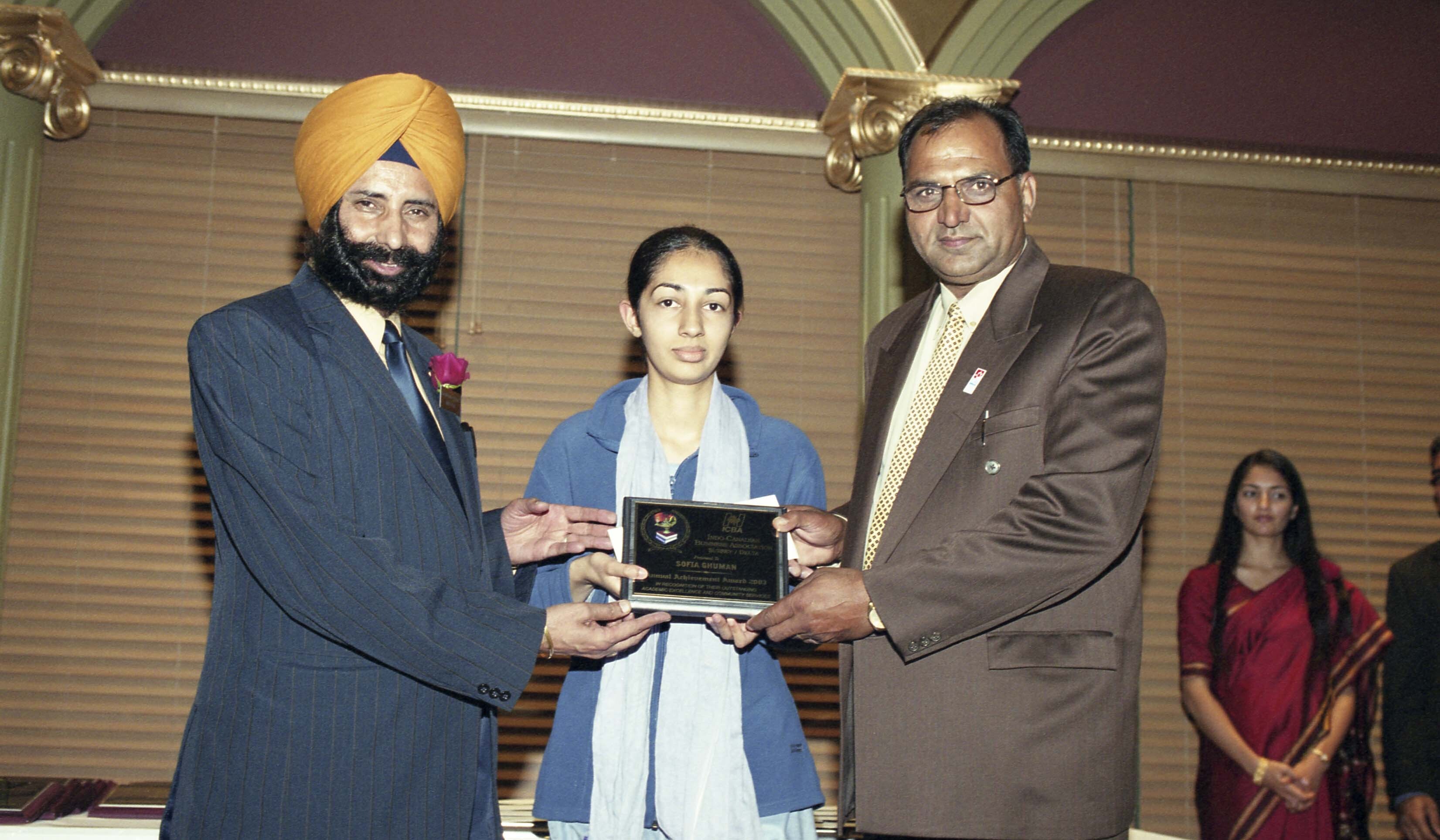Photograph of unidentified individuals holding an award at the 7th annual Indo-Canadian Business Association (ICBA) Achievement Awards. The award was presented to Sofia Ghuman in recognition of their outstanding academic excellence and community services. The event took place at the Crystal at York banquet hall in Surrey, British Columbia (B.C.).