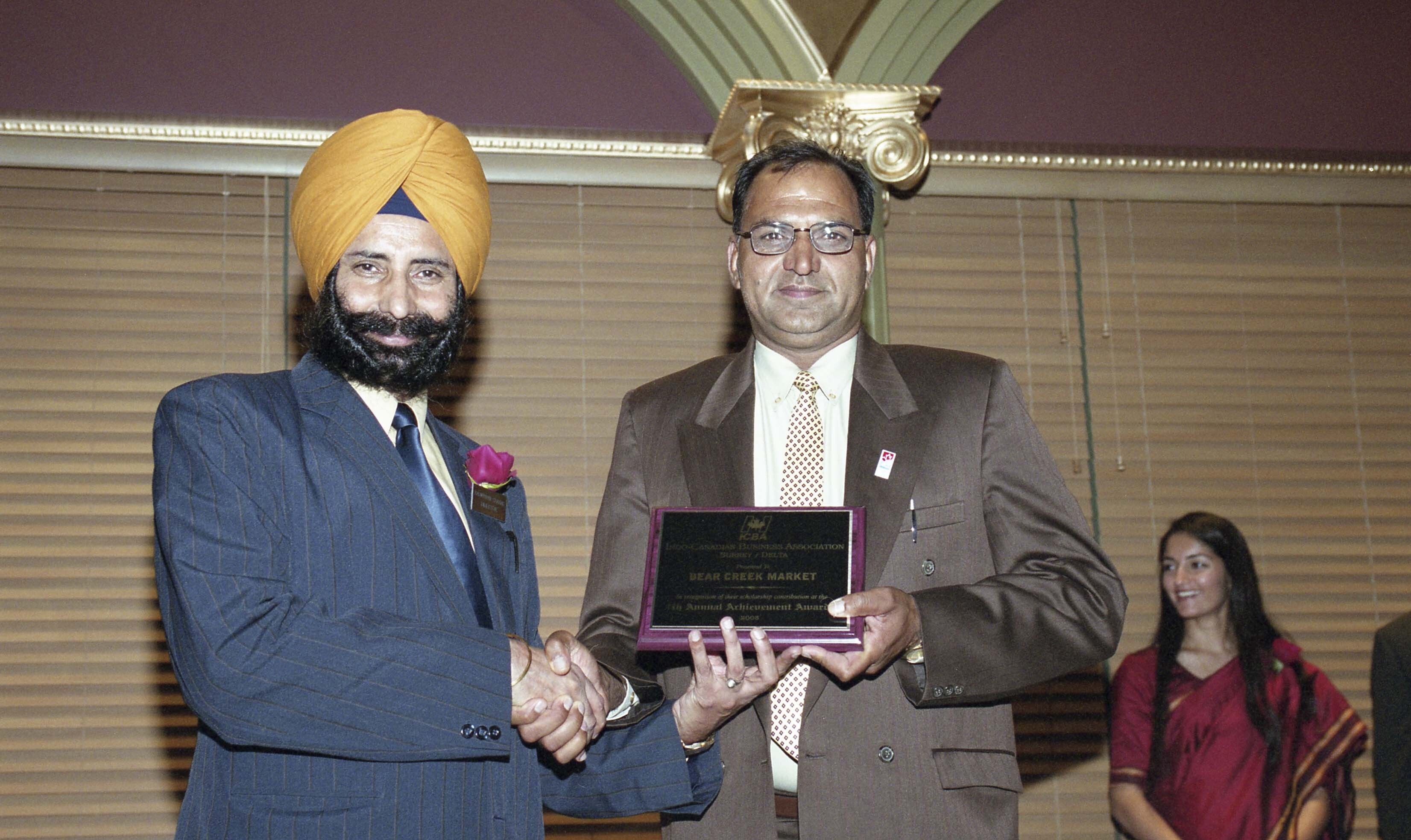 Photograph of unidentified individuals holding an award at the 7th annual Indo-Canadian Business Association (ICBA) Achievement Awards. The award was presented to Bear Creek Market in recognition of their scholarship contribution at the Achievement Awards. The event took place at the Crystal at York banquet hall in Surrey, British Columbia (B.C.).