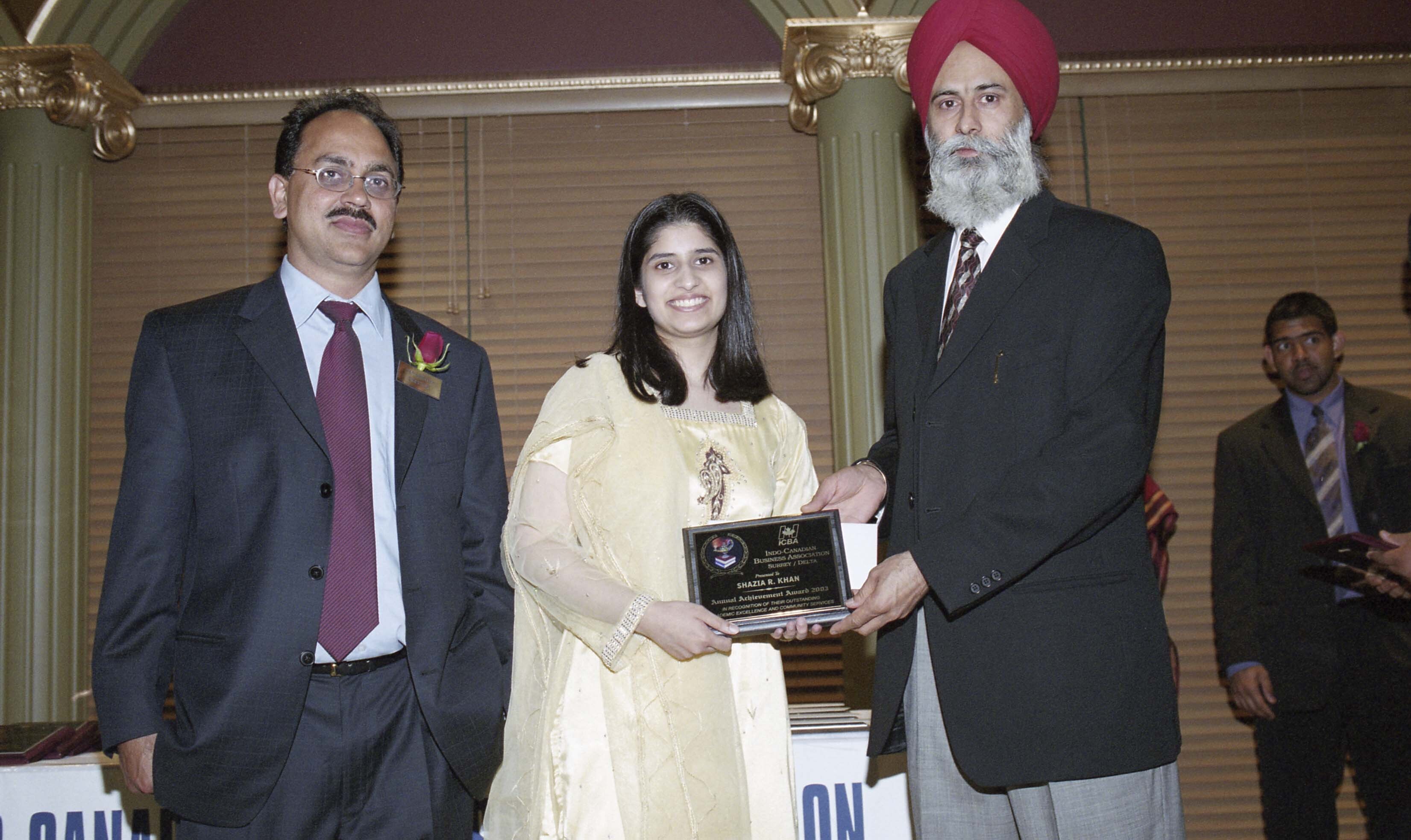 Photograph of unidentified individuals holding an award at the 7th annual Indo-Canadian Business Association (ICBA) Achievement Awards. The award was presented to Shazia R. Khan in recognition of their outstanding academic excellence and community services. The event took place at the Crystal at York banquet hall in Surrey, British Columbia (B.C.).