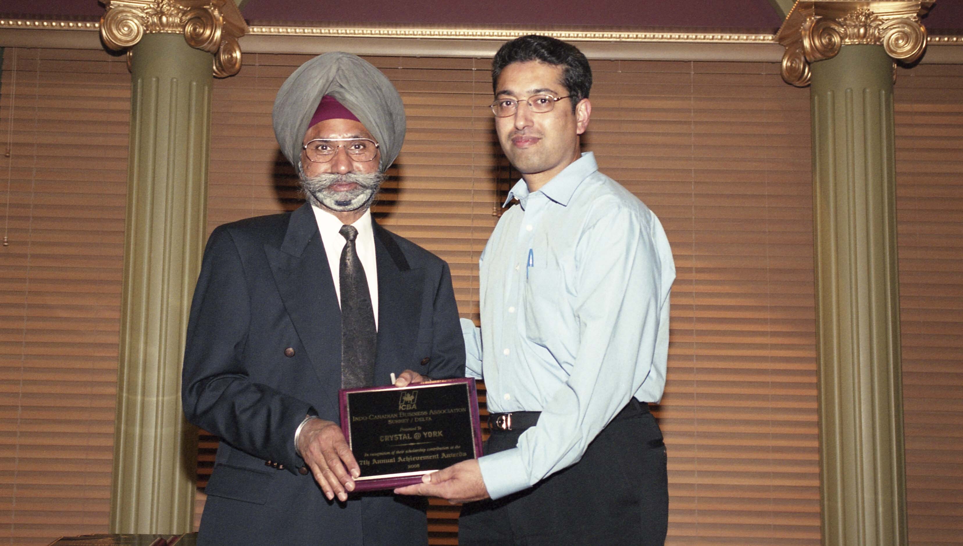 Photograph of unidentified individuals holding an award at the 7th annual Indo-Canadian Business Association (ICBA) Achievement Awards. The award was presented to Crystal @ York in recognition of their scholarship contribution at the Achievement Awards. The event took place at the Crystal at York banquet hall in Surrey, British Columbia (B.C.).