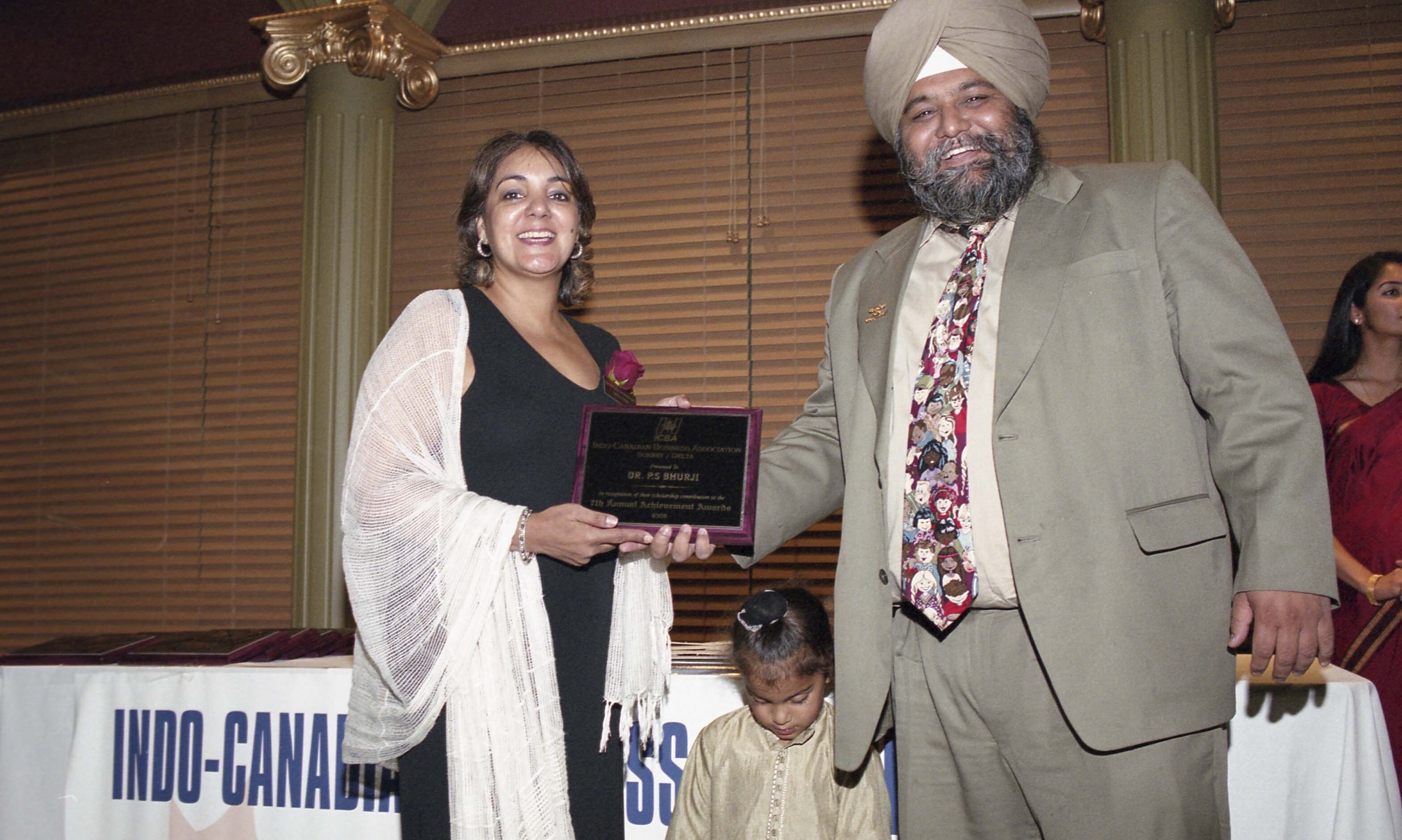 Photograph of unidentified individuals holding an award at the 7th annual Indo-Canadian Business Association (ICBA) Achievement Awards. The award was presented to Dr. P.S Bhurji in recognition of their scholarship contribution at the Achievement Awards. The event took place at the Crystal at York banquet hall in Surrey, British Columbia (B.C.).