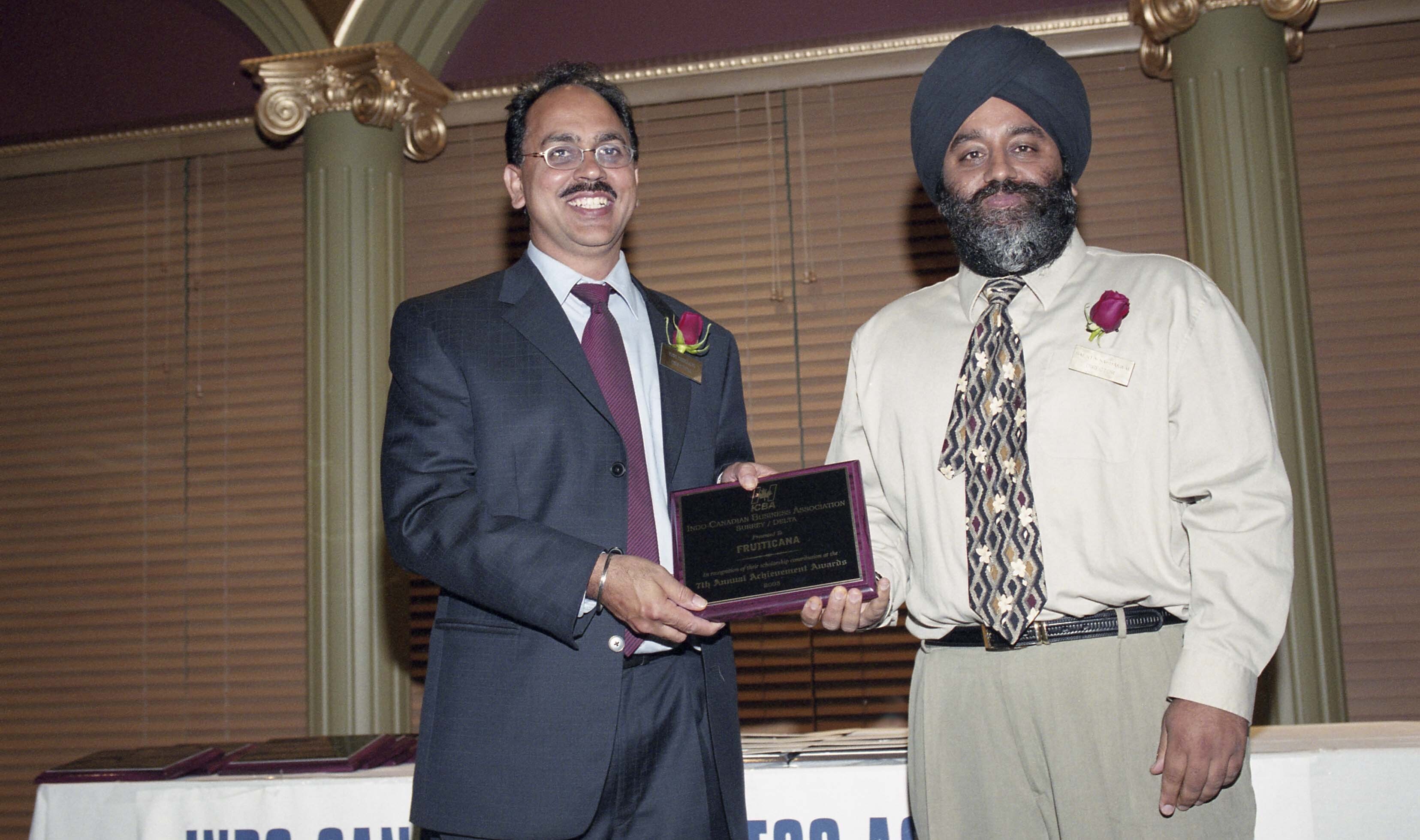 Photograph of unidentified individuals holding an award at the 7th annual Indo-Canadian Business Association (ICBA) Achievement Awards. The award was presented to Fruiticana in recognition of their scholarship contribution at the Achievement Awards. The event took place at the Crystal at York banquet hall in Surrey, British Columbia (B.C.).
