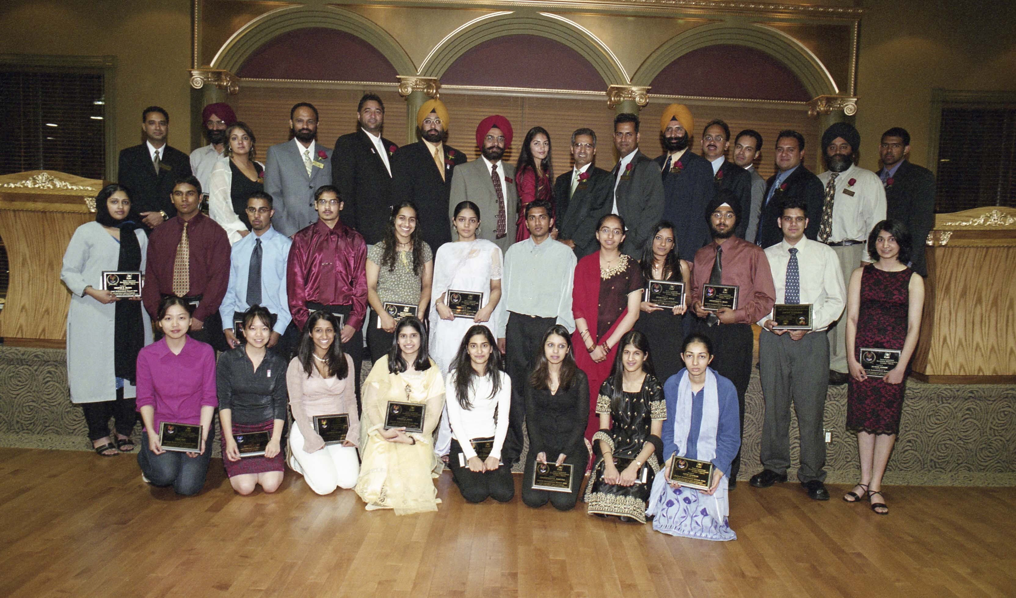 Photograph of a group of unidentified individuals, some holding awards, at the 7th annual Indo-Canadian Business Association (ICBA) Achievement Awards. The event took place at the Crystal at York banquet hall in Surrey, British Columbia (B.C.). Jolly Dhaliwal can be seen among the group of individuals.